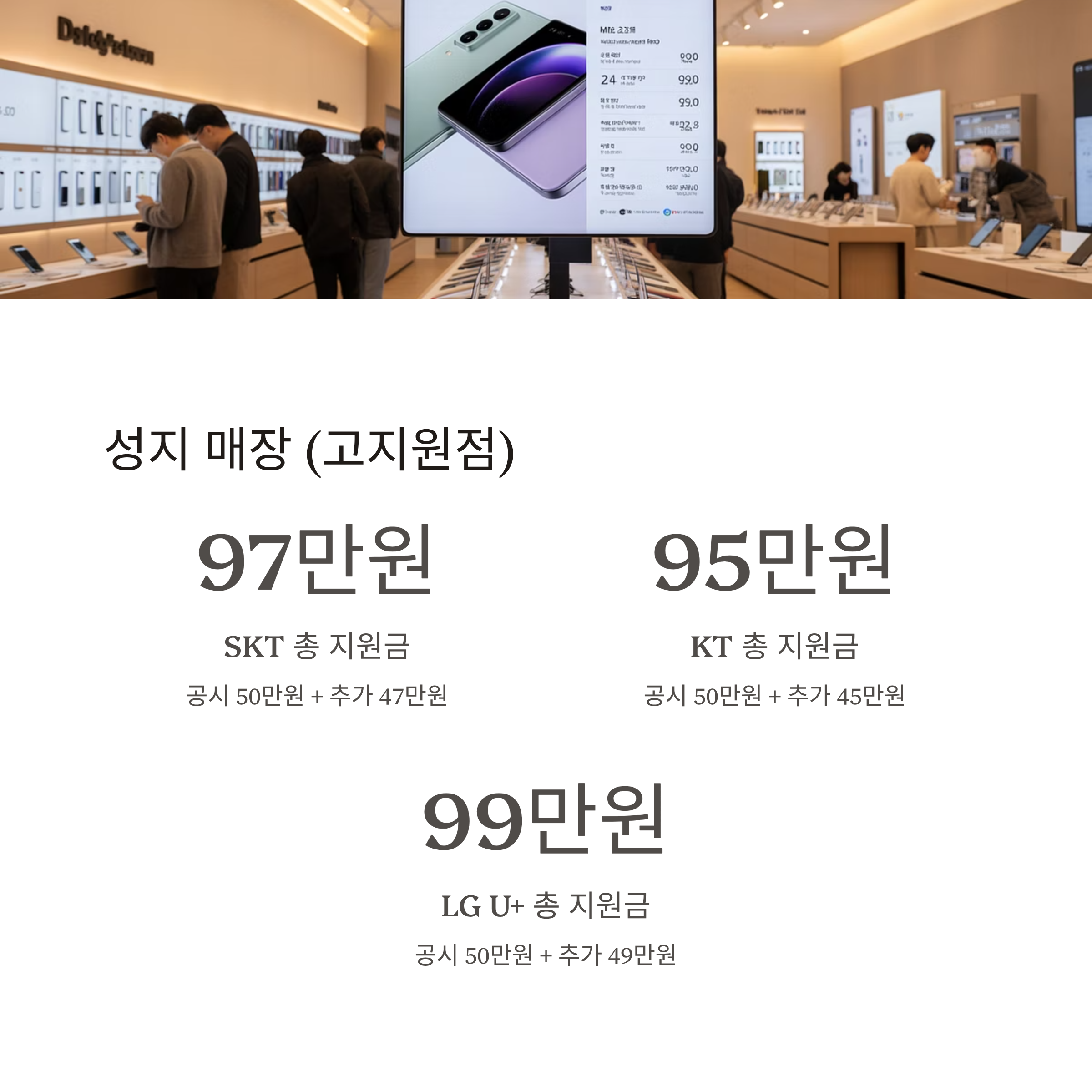 | 성지 매장 | 약 50만 원 | 45~49만 원 | 95~99만 원+α | 최고 혜택, 조건 협상 중요 |