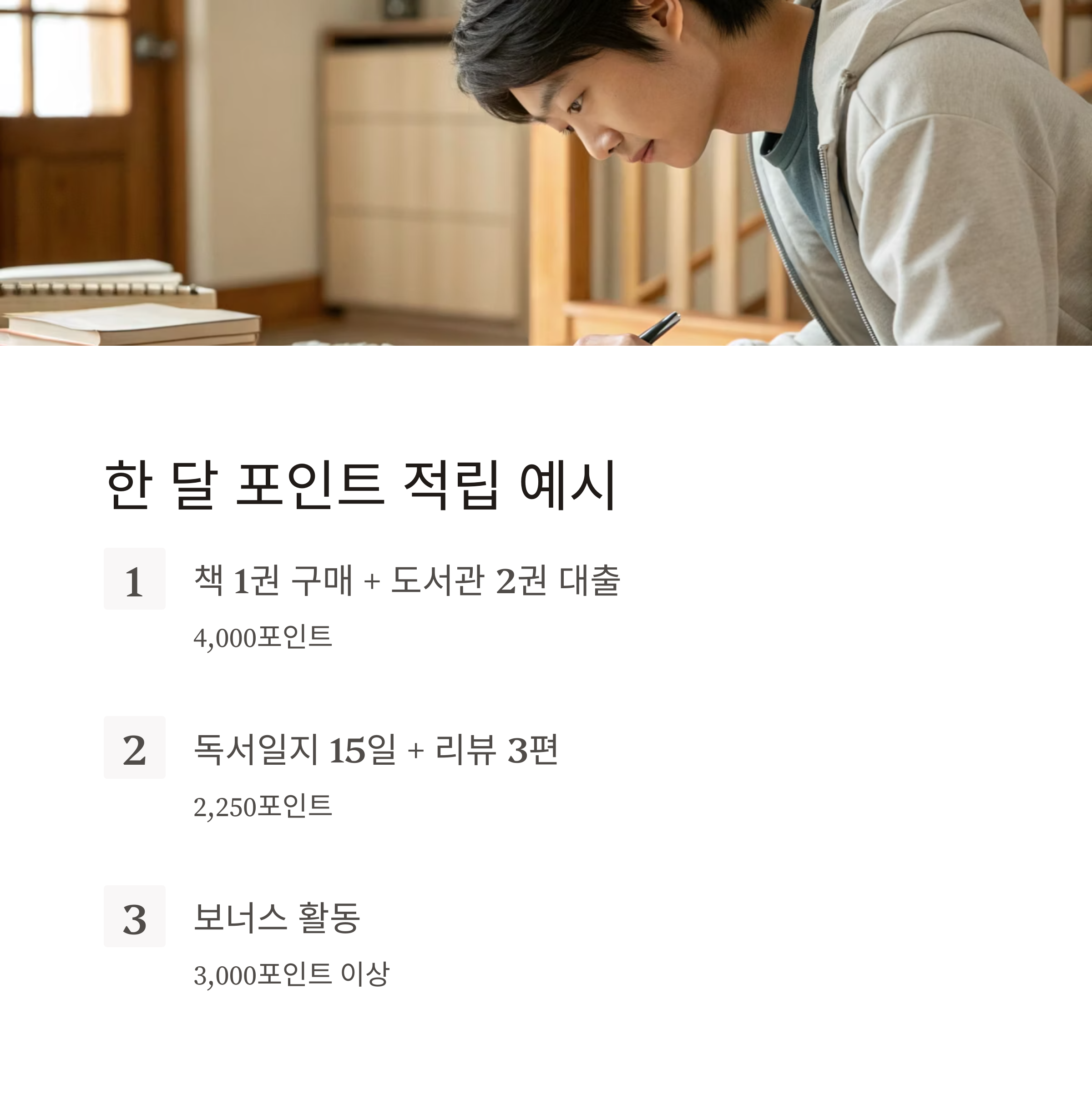 출석 챌린지 | 21일 연속 독서일지 작성 시 추가 포인트 제공 |