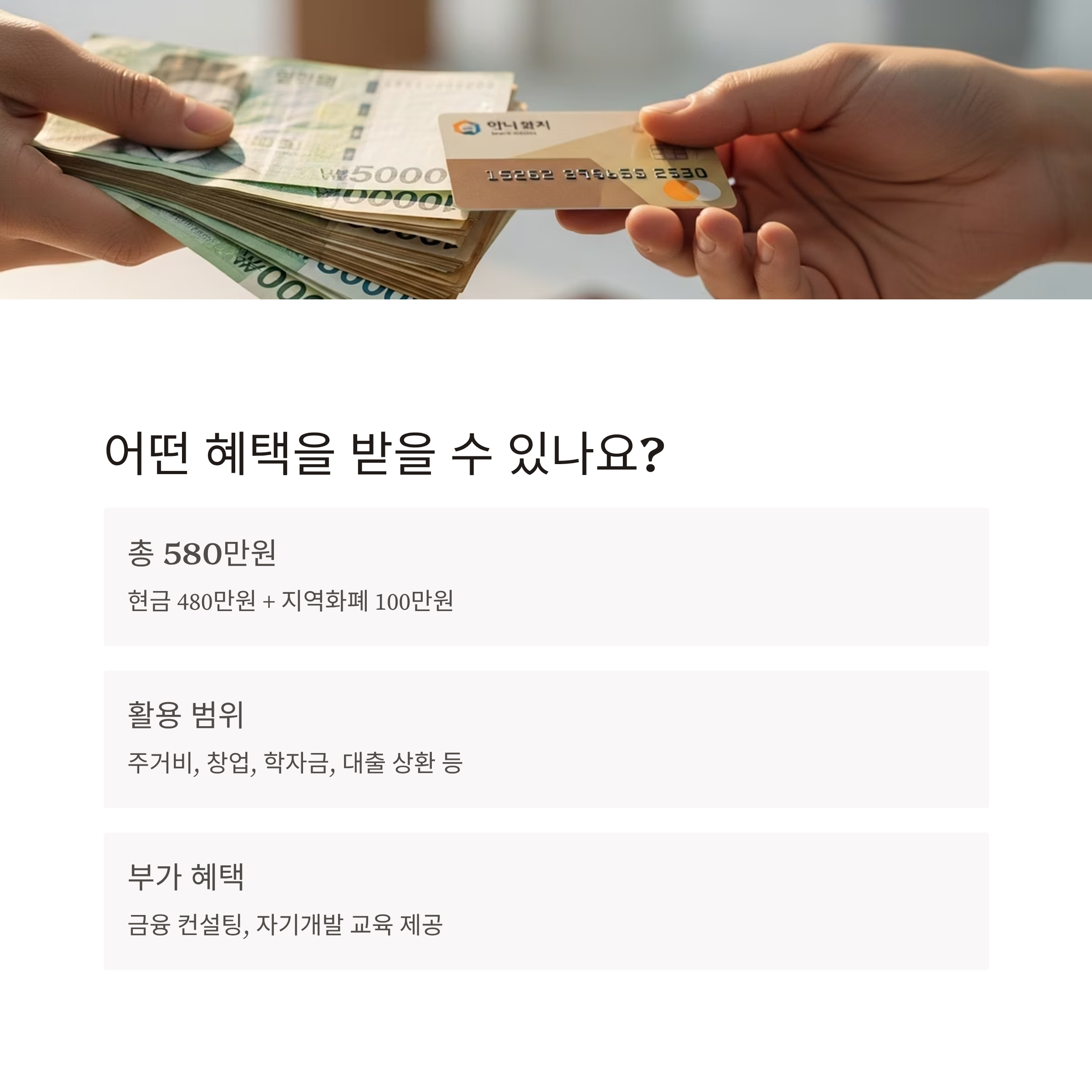 | 지원금 | 총 580만 원 (현금 480 + 지역화폐 100) |