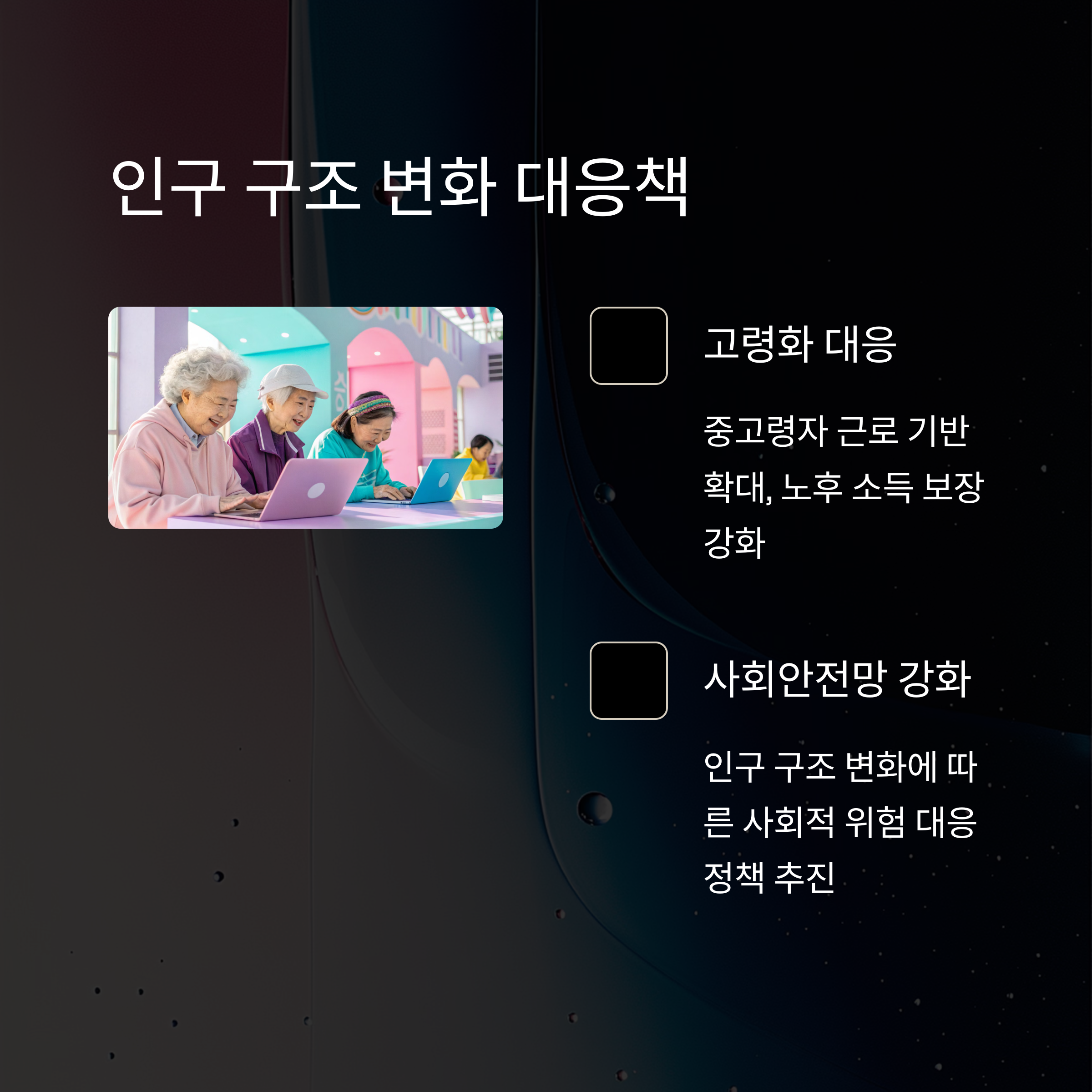 - 사회안전망 강화: 인구 구조 변화에 따른 사회적 위험에 대응하기 위해 사회안전망을 강화하고, 관련 정책을 추진합니다.