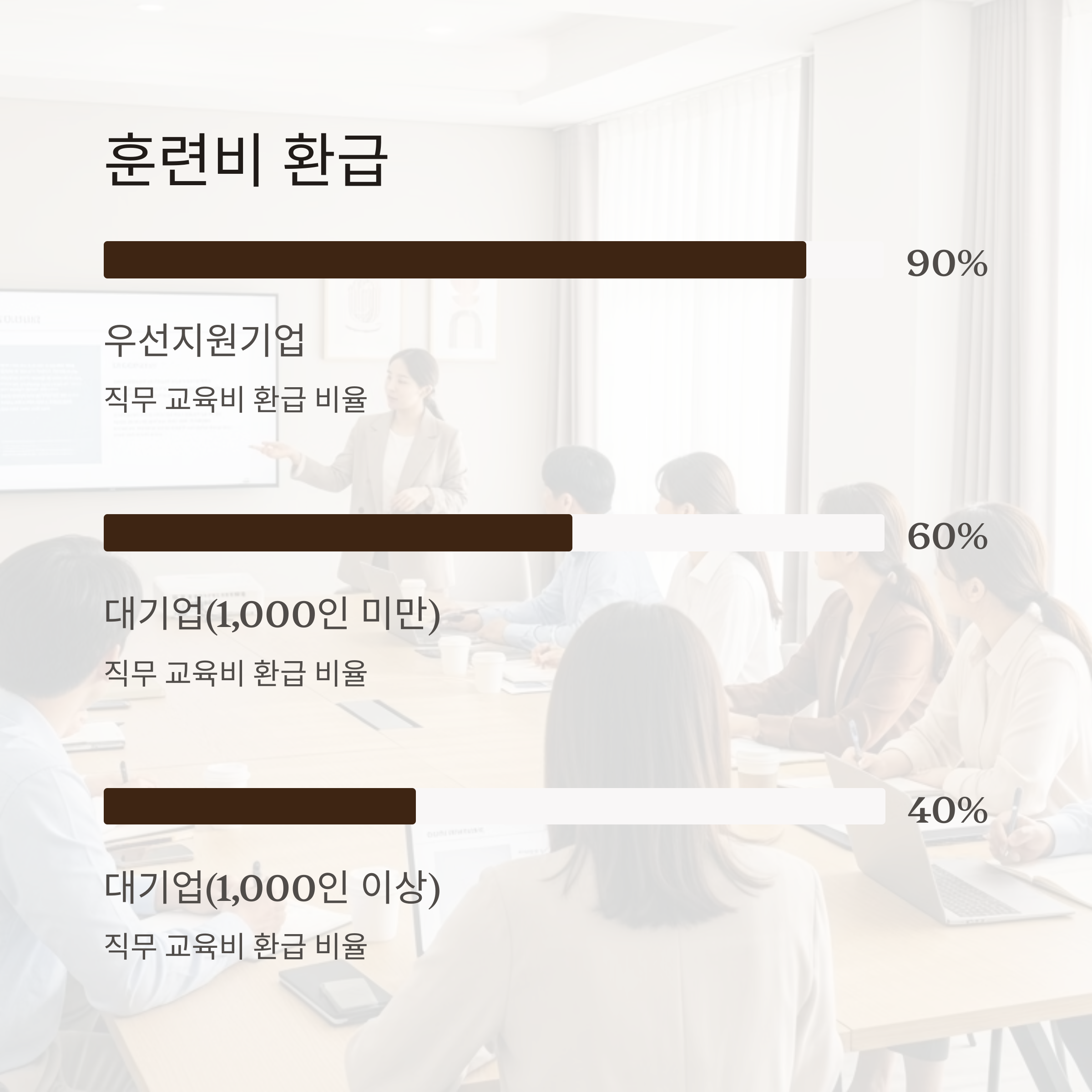 훈련비 환급 훈련 실시 사업주 근로자 훈련 수료 우선지원 90% / 대기업 최대 60%