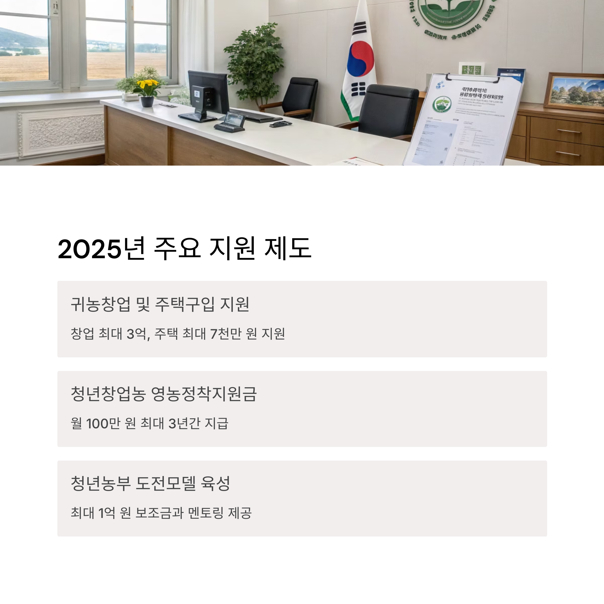 | 귀농창업 및 주택구입 지원사업 | 영농 창업자금(시설·장비·운영) + 주택자금 지원 | 창업 최대 3억 / 주택 최대 7천만 원 |