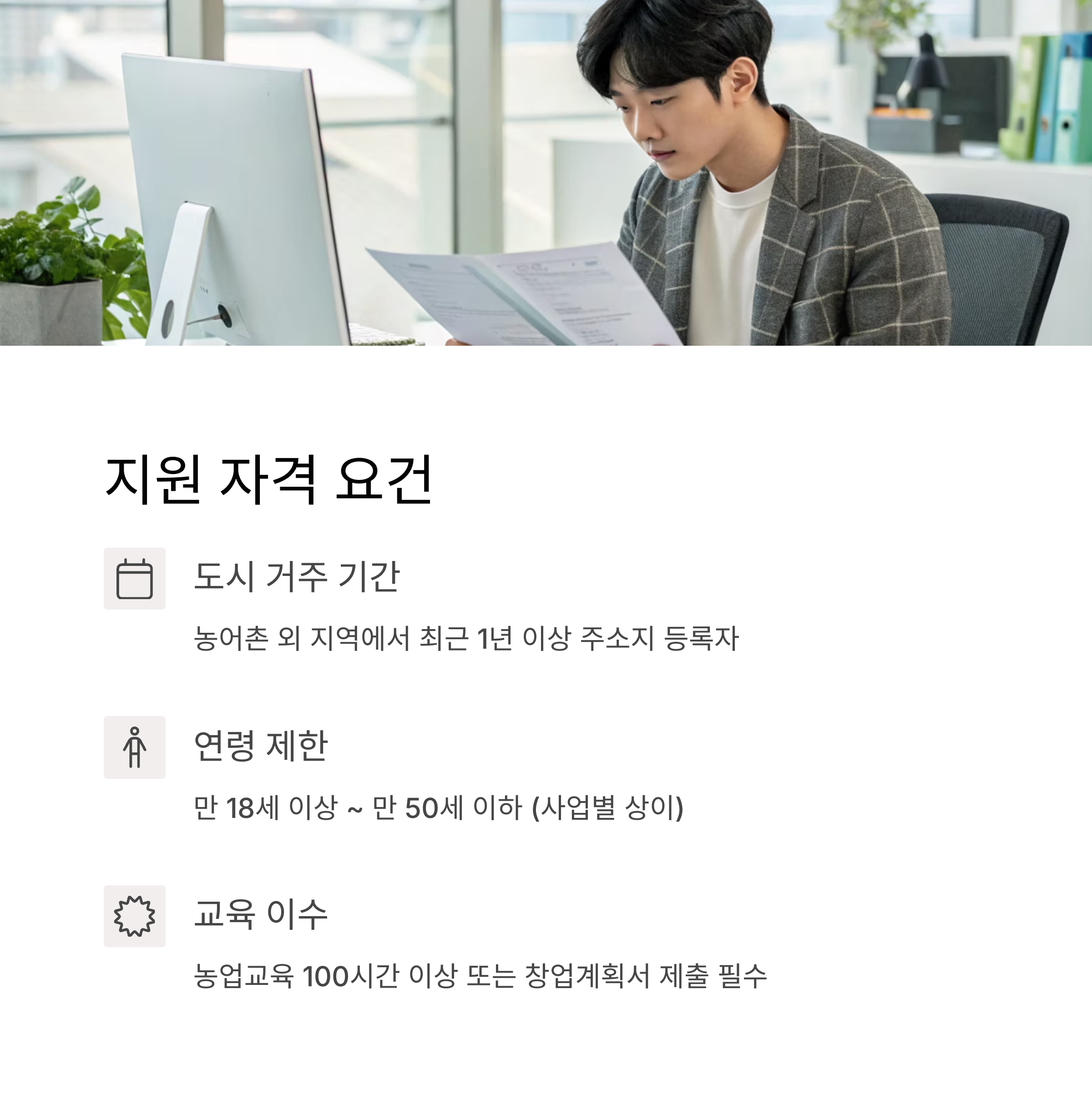 | 교육 이수자 | 농업교육 100시간 이상 또는 창업계획서 제출자 |
