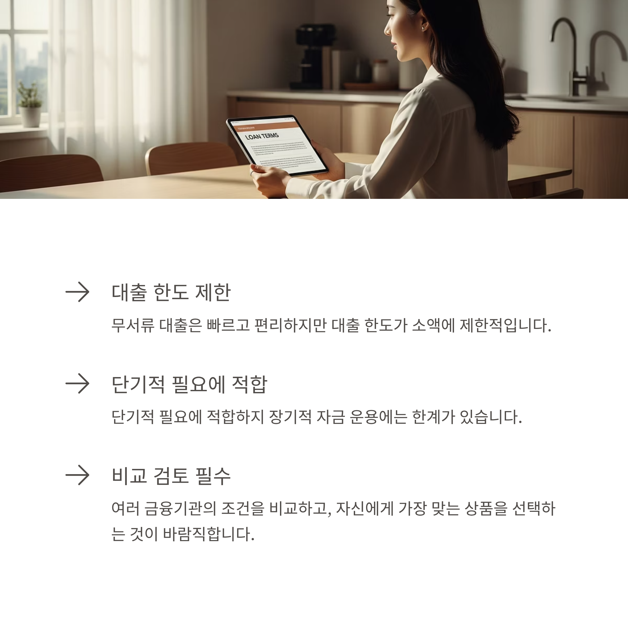 대출 자체는 간편하지만, 상환이 계획적이지 않다면 연체로 인해 신용도 하락 위험이 있습니다.