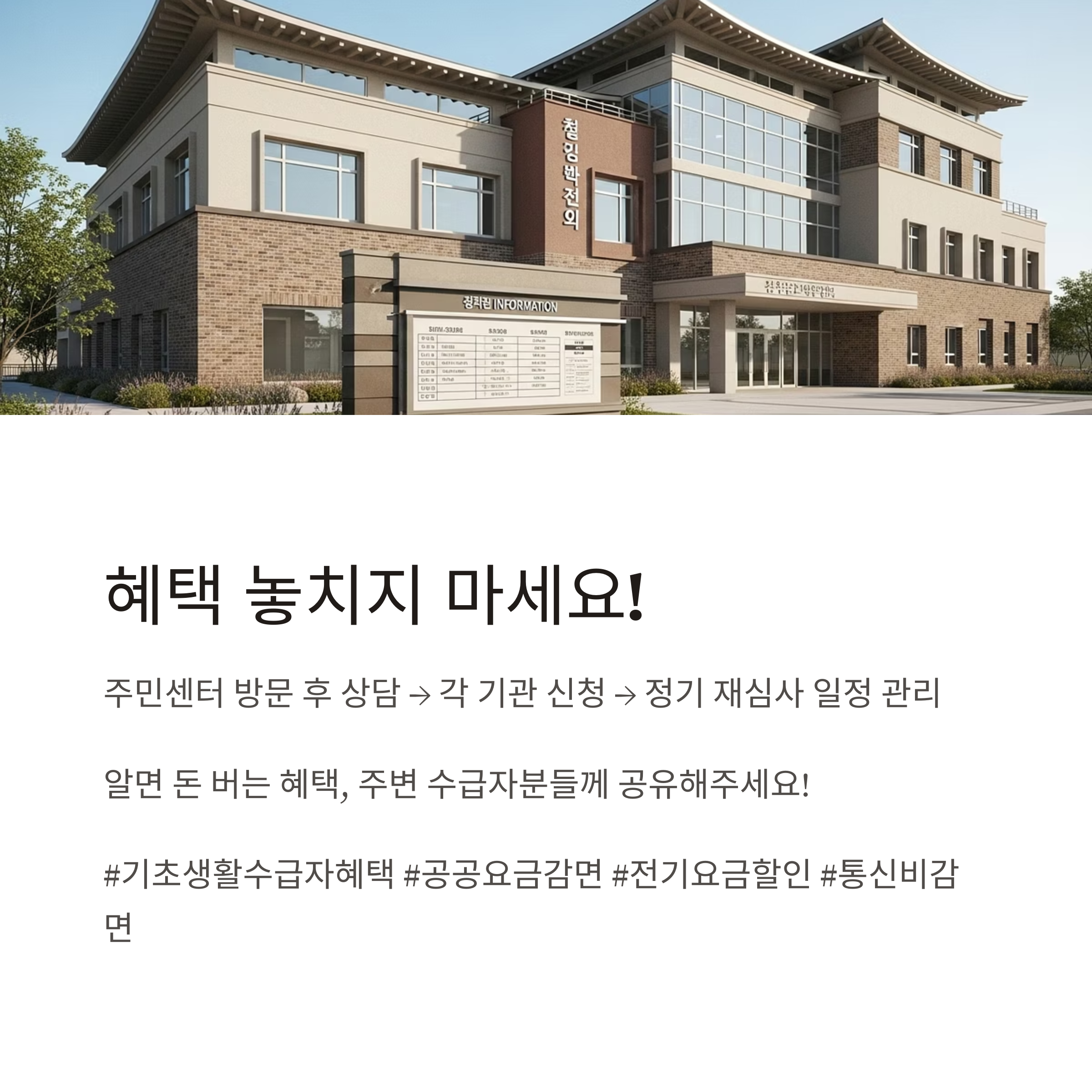 | 요금감면 | 전기·가스·수도·종량제·TV수신료·주민세·통신·인터넷 등 전방위 감면 적용 |