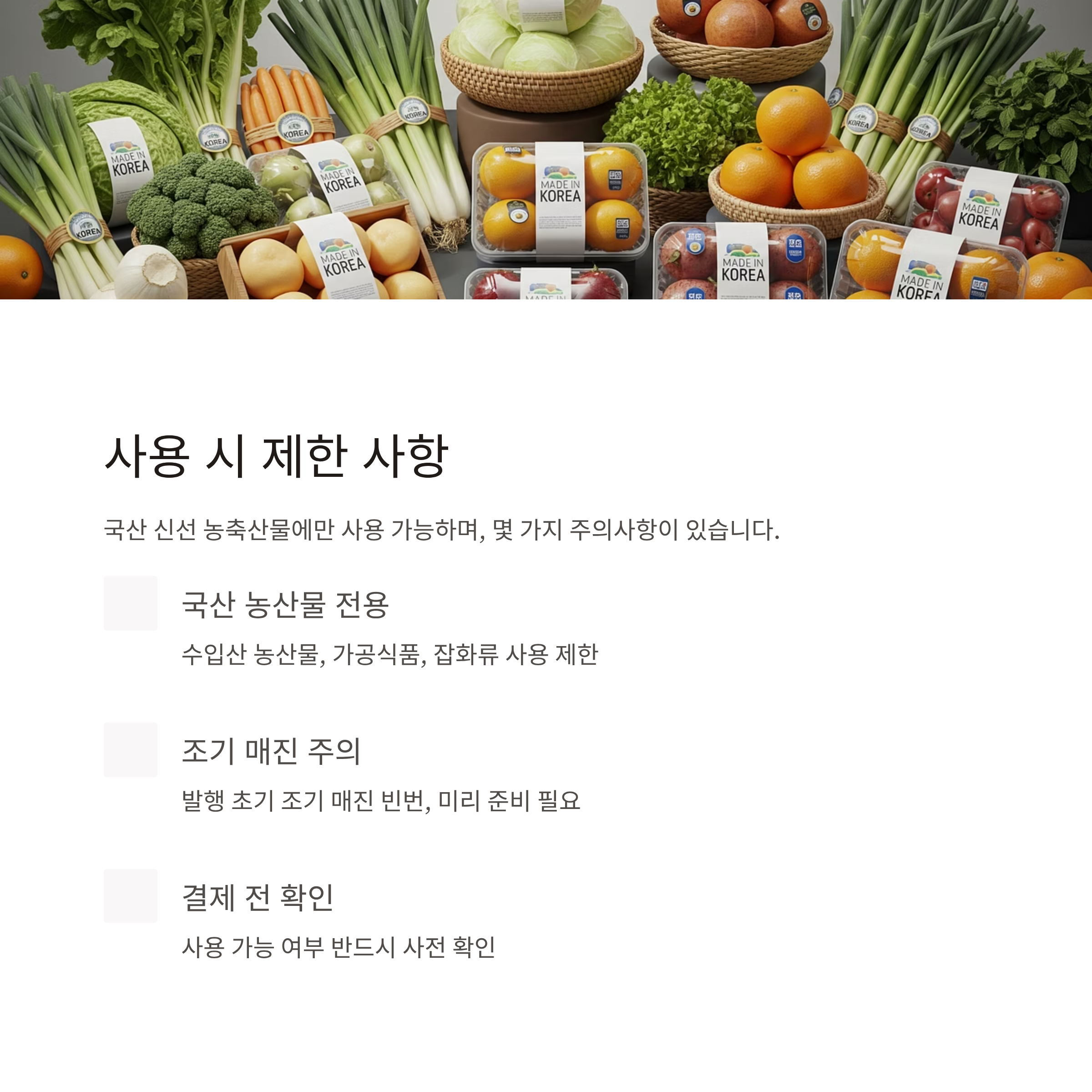 농할상품권은 반드시 국산 신선 농축산물에만 사용할 수 있습니다. 수입산 농산물, 가공식품, 잡화류 등은 사용이 제한될 수 있으니 결제 전 확인이 필수입니다. 또한 발행 초기에는 조기 매진이 빈번하므로 발행 시간에 맞춰 미리 준비해두는 것이 좋습니다.