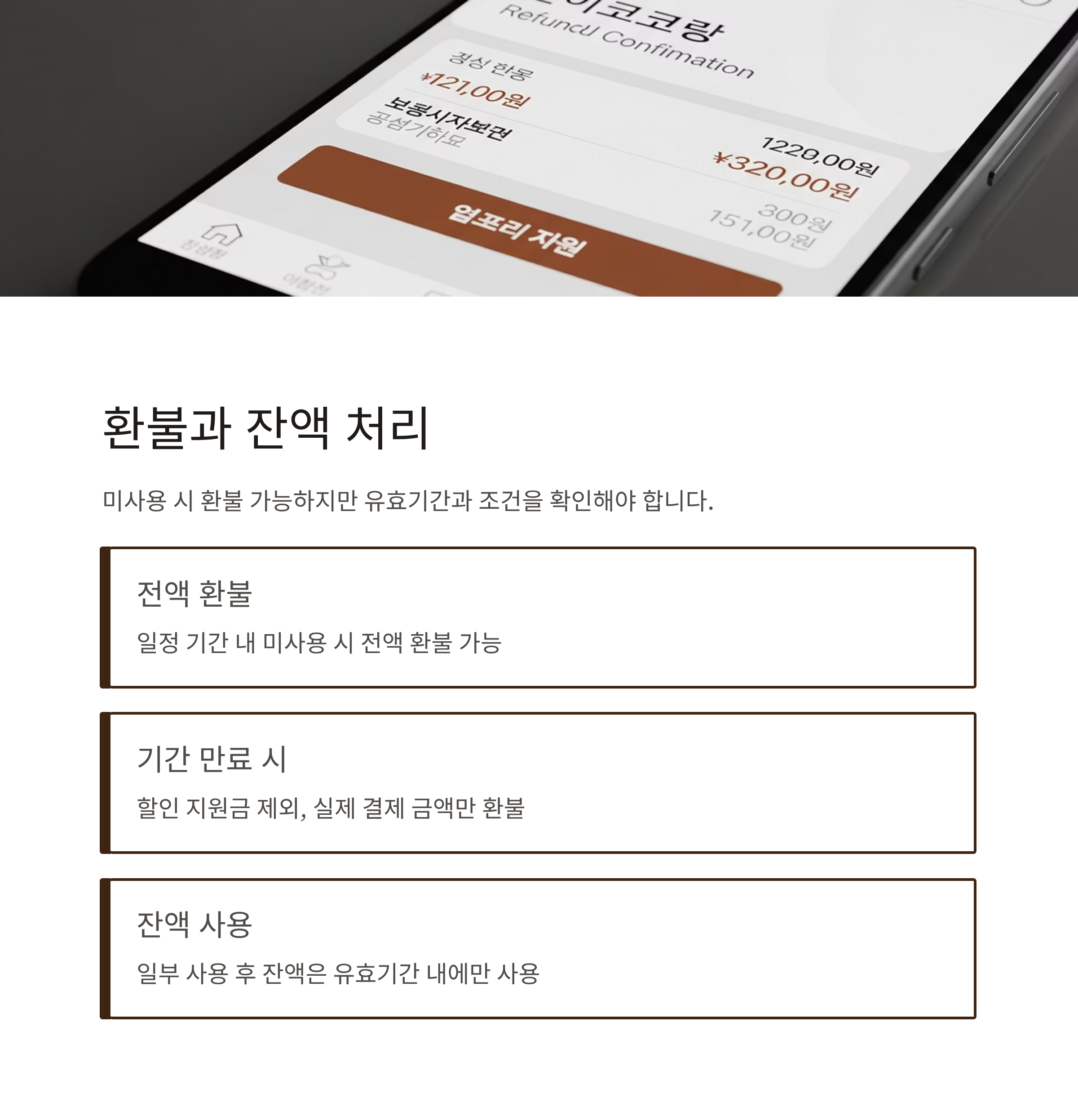 구매 후 일정 기간 내 미사용 시 전액 환불이 가능합니다. 그러나 유효기간이 지나면 할인 지원금은 제외되고 실제 결제 금액 기준으로만 환불됩니다. 또한 일부만 사용한 경우 잔액은 유효기간 내에만 사용할 수 있으며, 잔액 환불 시에도 동일한 조건이 적용됩니다.
