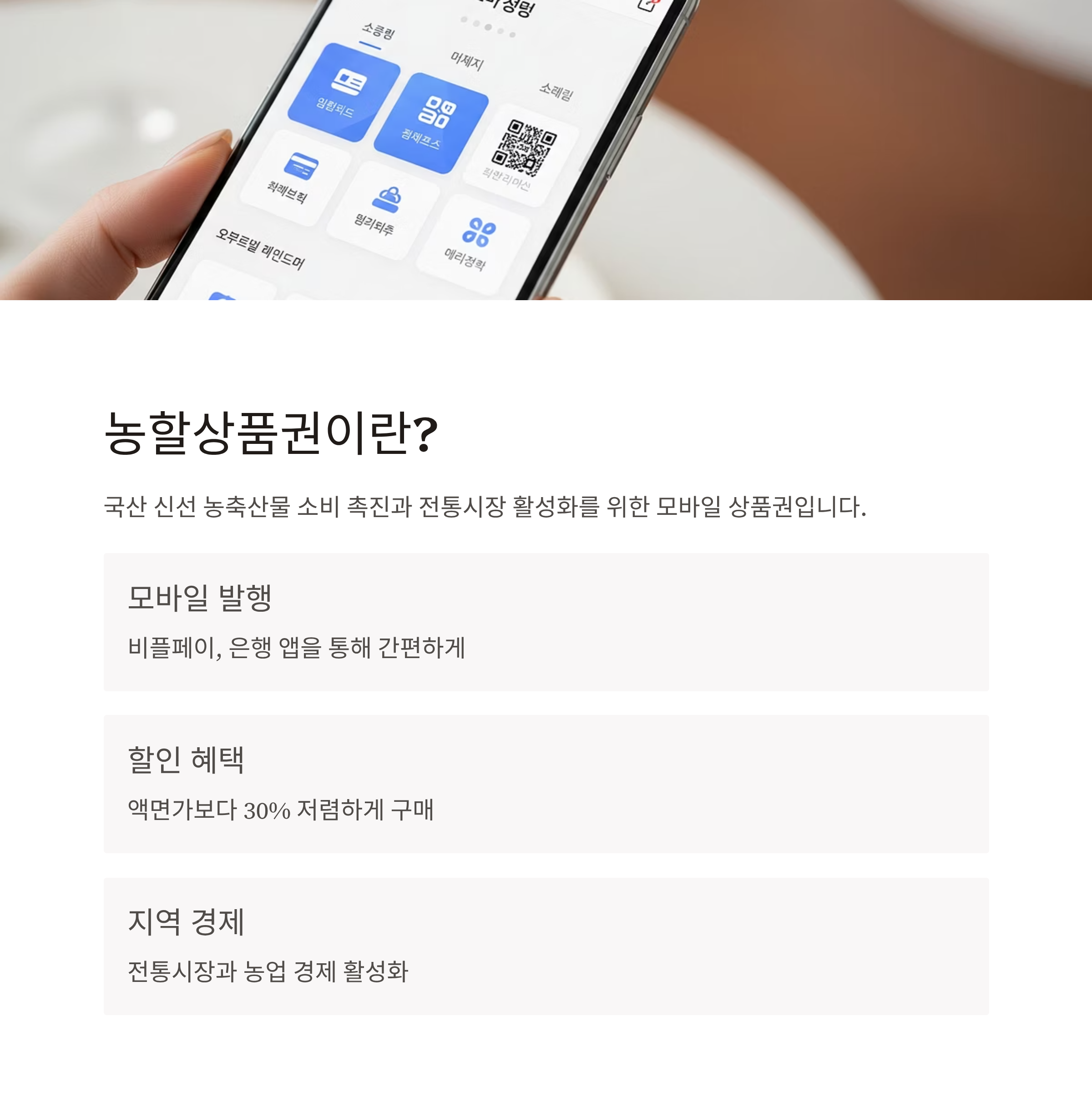 농할은 농축산물 할인이라는 뜻을 담고 있으며, 상품권은 비플페이나 은행 앱을 통해 모바일로 발행됩니다. 신선한 국산 농축산물 소비 촉진과 지역 전통시장 활성화가 핵심 목적입니다. 실제 구매 시 액면가보다 30% 저렴하게 구매 가능하다는 점이 가장 큰 장점입니다.