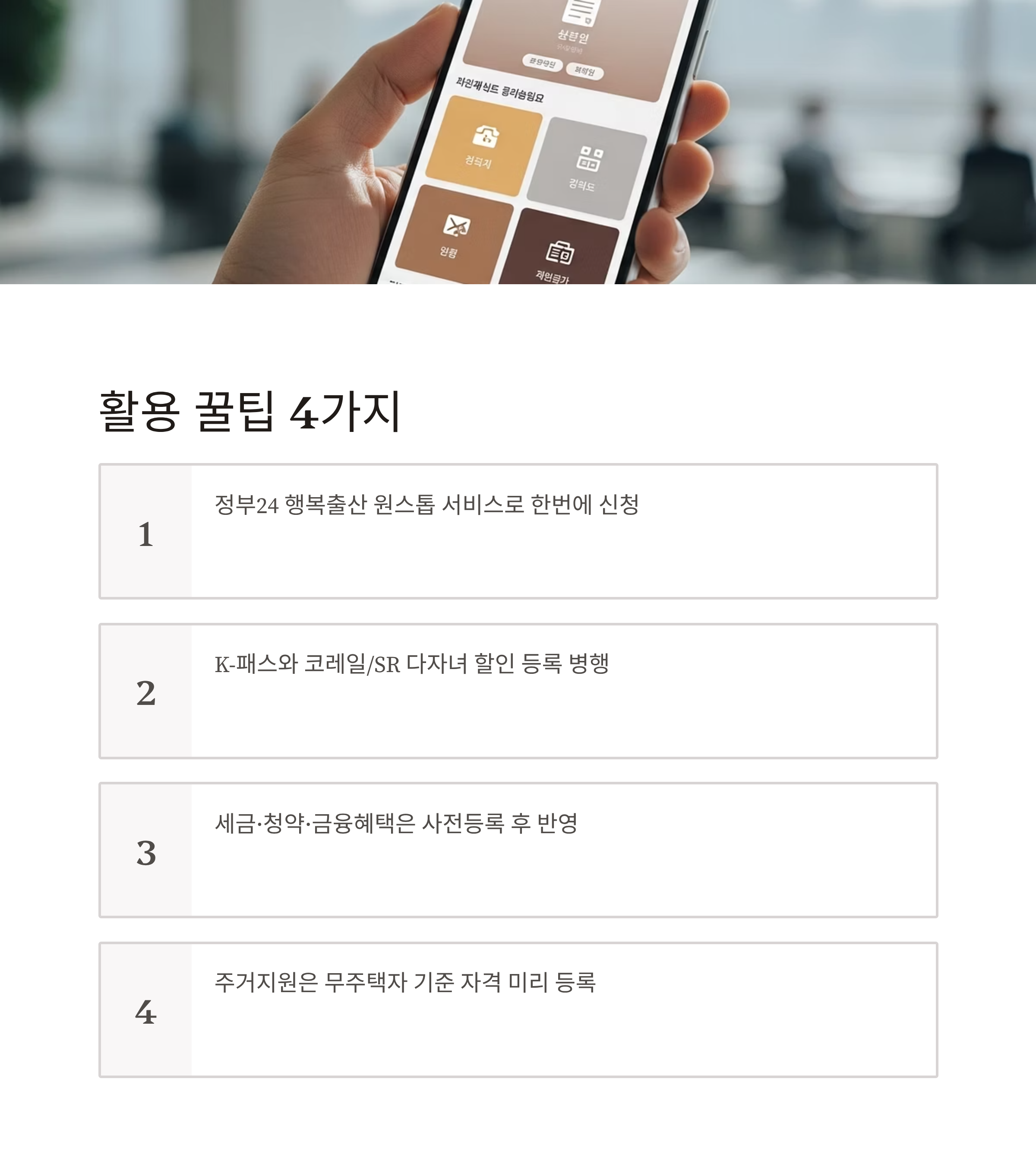 - 다자녀카드 발급, 정부24 출산혜택 신청, KTX/SRT·K‑패스 등록 등은 미리 준비해두면 연간 수십만 원 절감