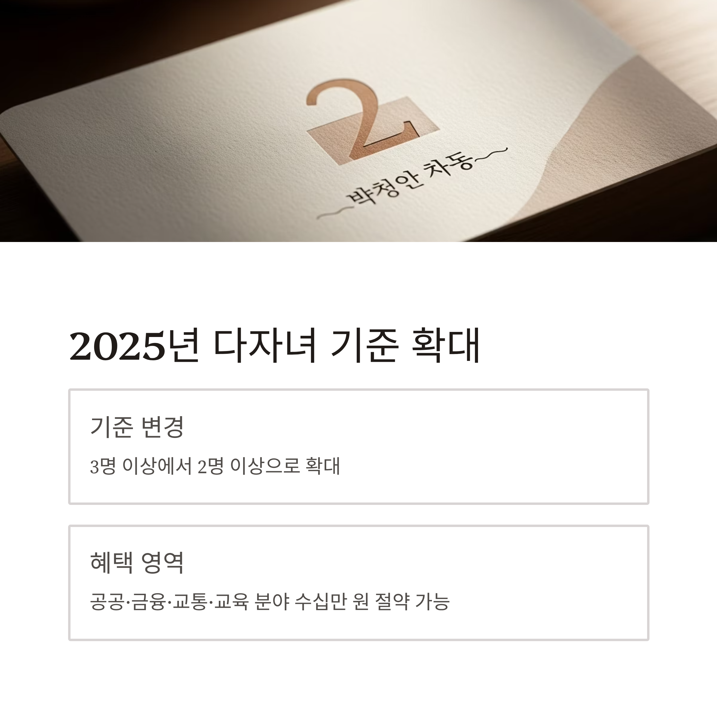 | 다자녀 정의 | 자녀 2명 이상(18세 미만) | 2025년부터 전국 공통 기준으로 완화 적용 |