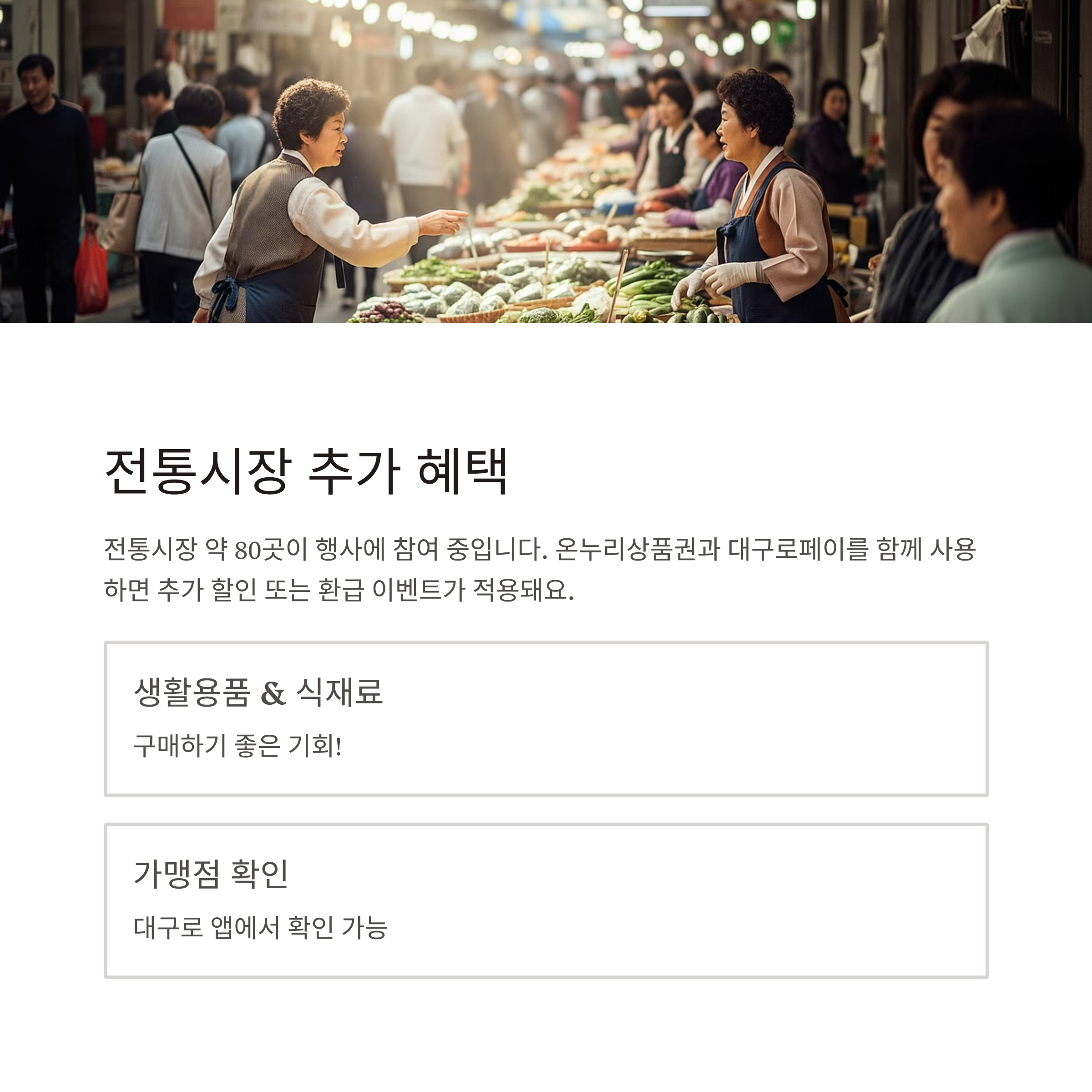 | 전통시장 | 온누리 + 대구로페이 사용 시 추가 할인/환급 | 참여 시장 확인, 행사 기간 유동적 |