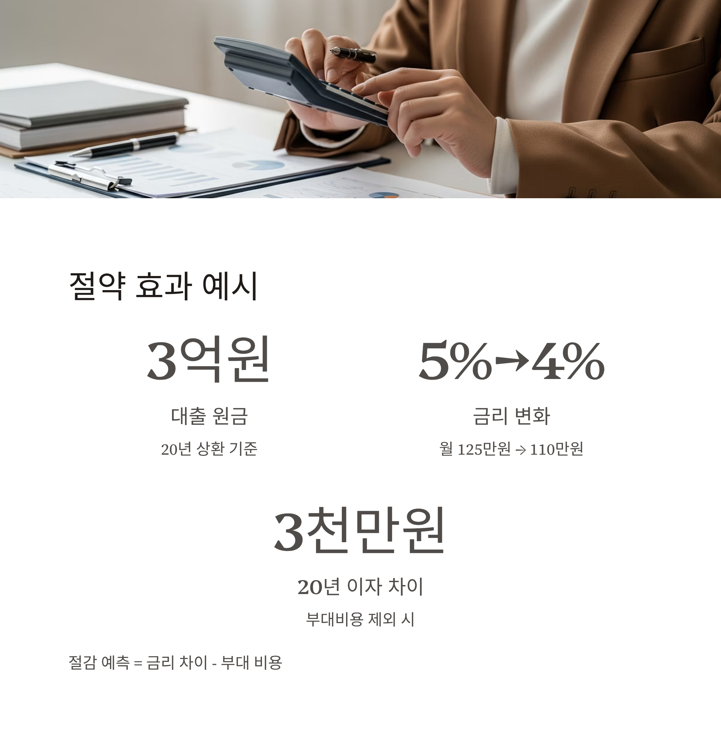 예를 들어 3억 원을 연 5% 금리로 20년간 대출받았다면, 월 이자는 약 125만 원입니다. 이를 4%로 대환하면 약 110만 원으로 줄어요.