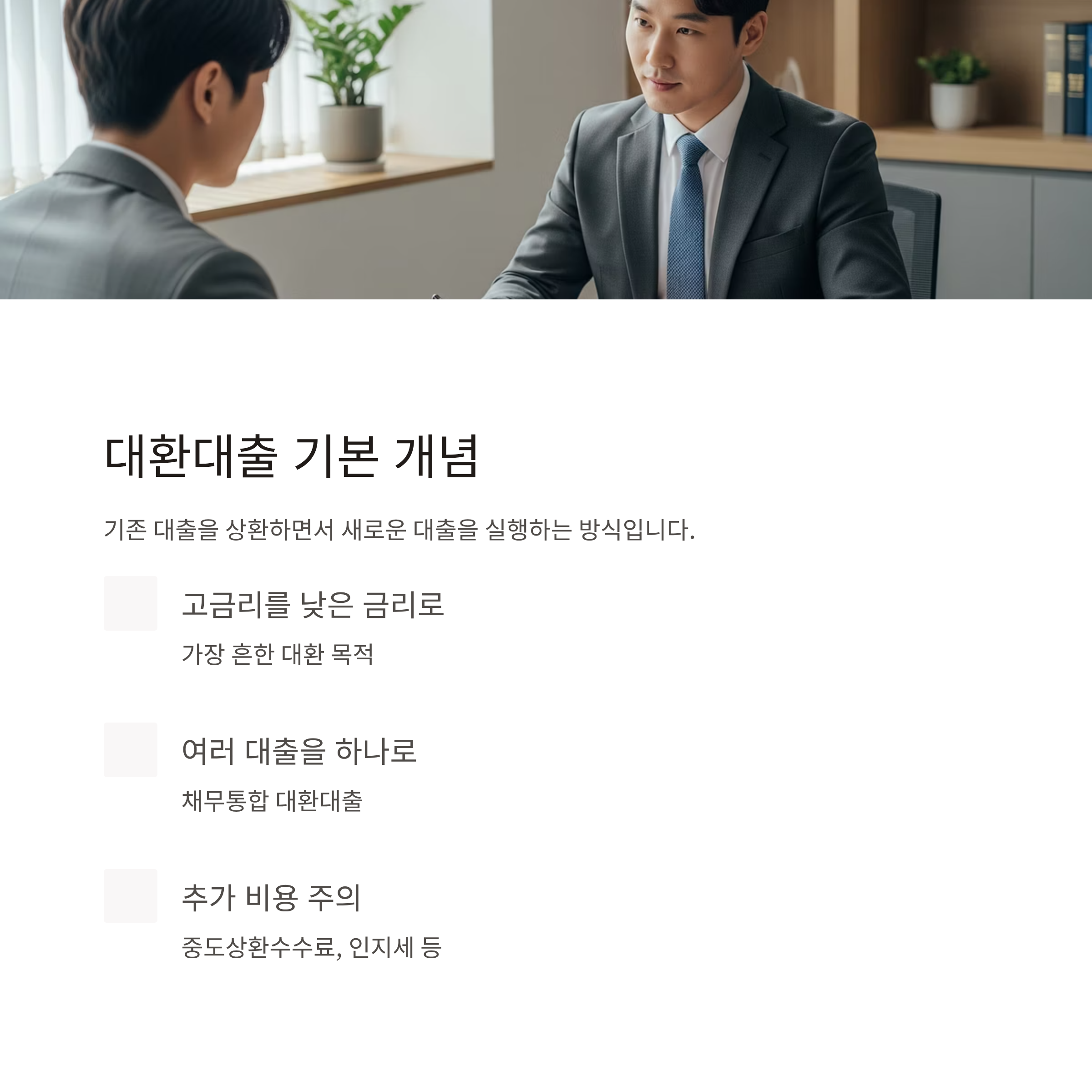 대환대출은 기존 대출을 상환하면서 새로운 대출을 실행하는 방식입니다. 목적은 단 하나, 더 유리한 조건이죠.