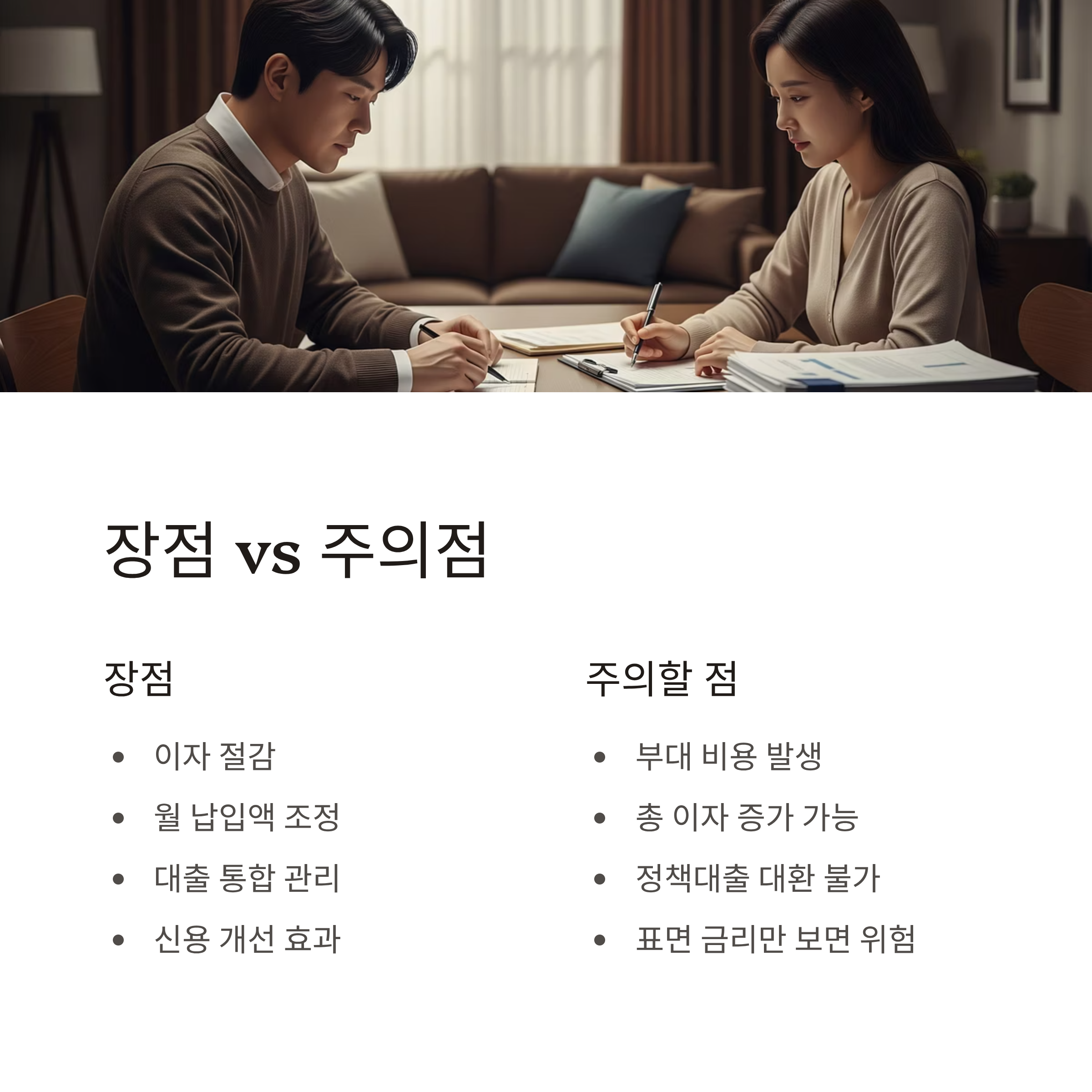 | 신용 개선 효과 기대 가능 | 조건 비교 시 표면 금리만 보면 위험, 총비용 고려 필수 |