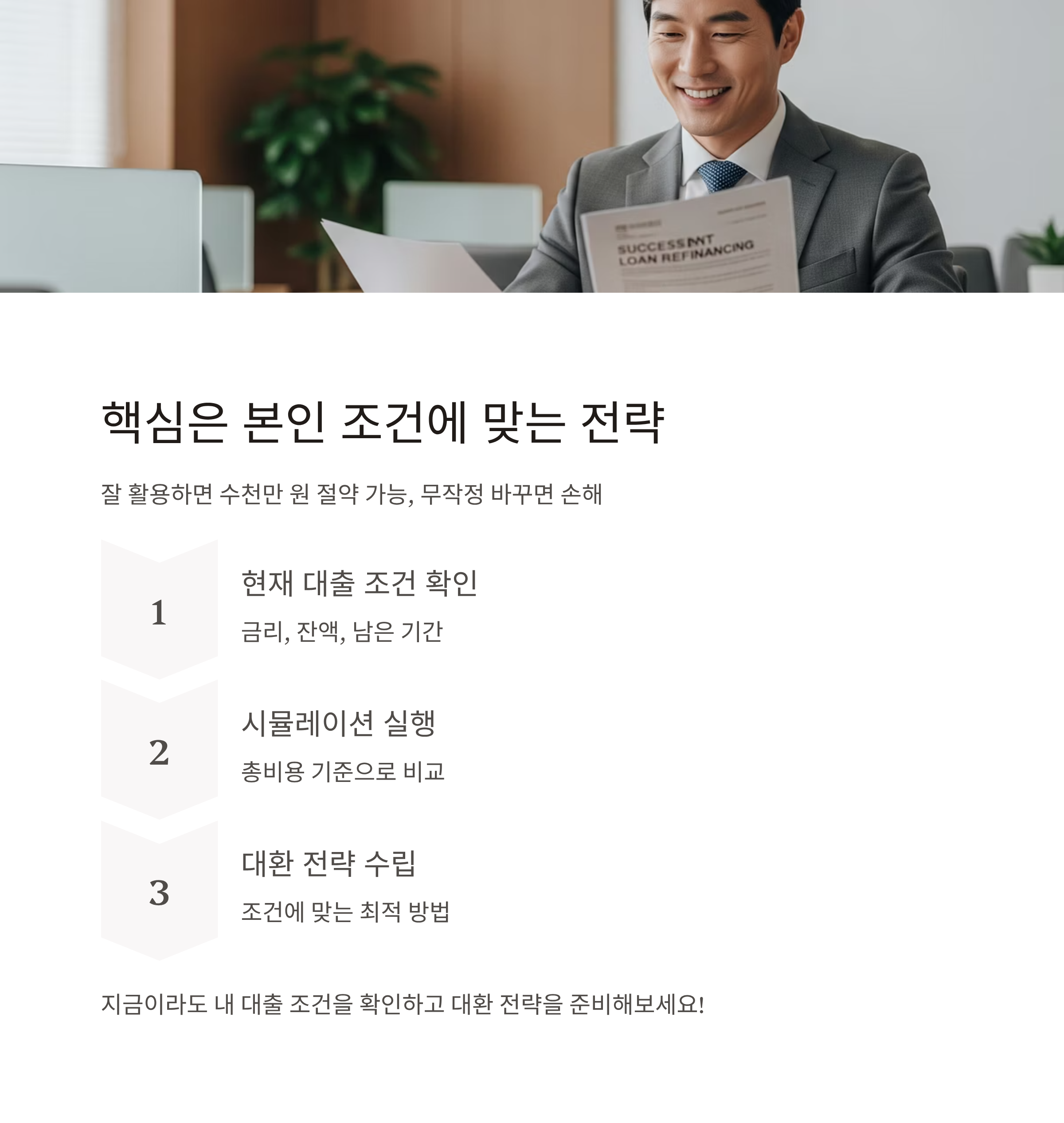 지금이라도 내 대출 금리, 잔액, 남은 기간 등을 확인하고 조건 맞는 대환 전략을 준비해보세요.