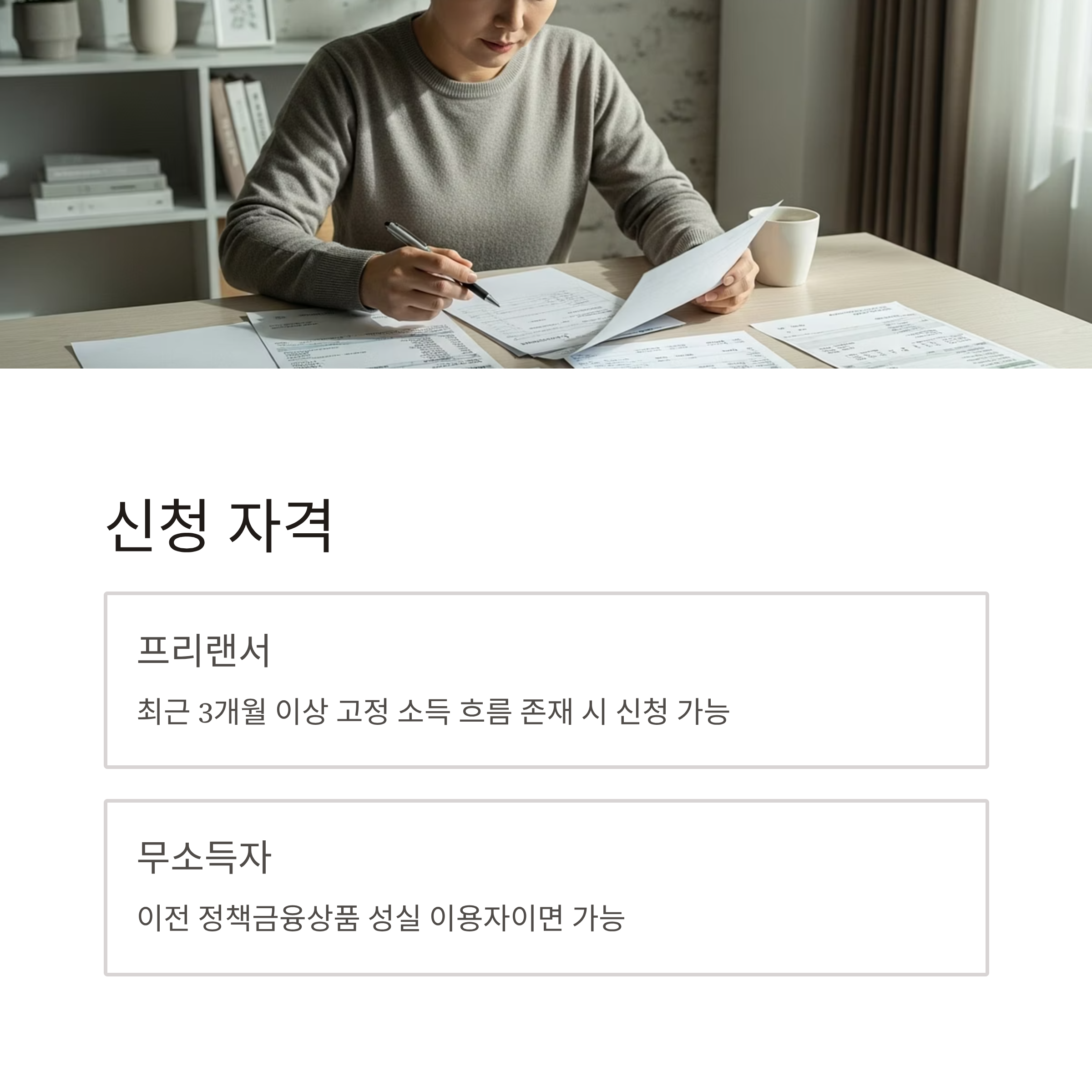 | 프리랜서 | 소득세 3.3% 원천징수 후 입금되고, 최근 3개월 이상 고정 소득 흐름 존재 시 신청 가능 |