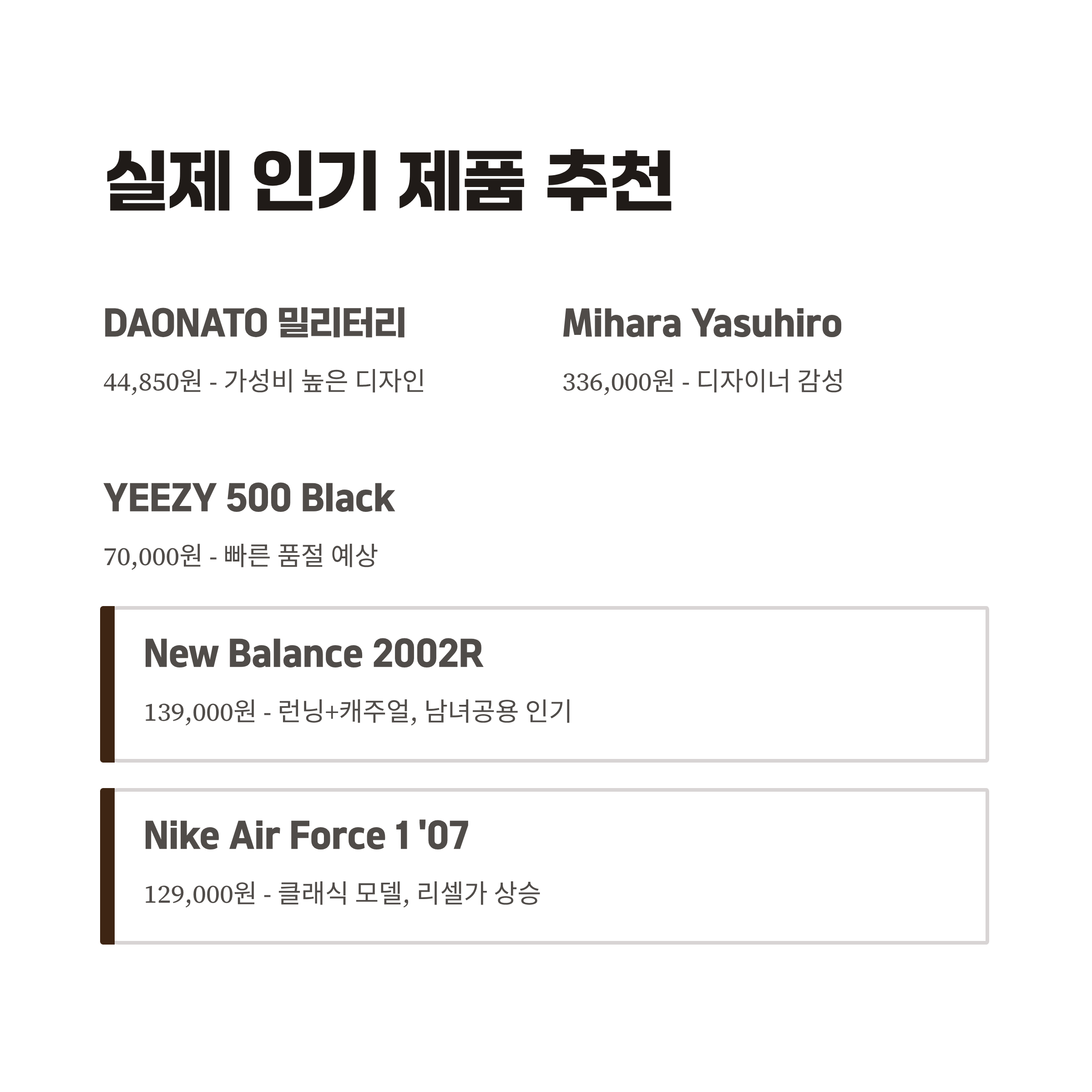 | Nike Air Force 1 ’07 | 129,000원 | 나이키 대표 클래식, 매 시즌 리셀가 상승 |
