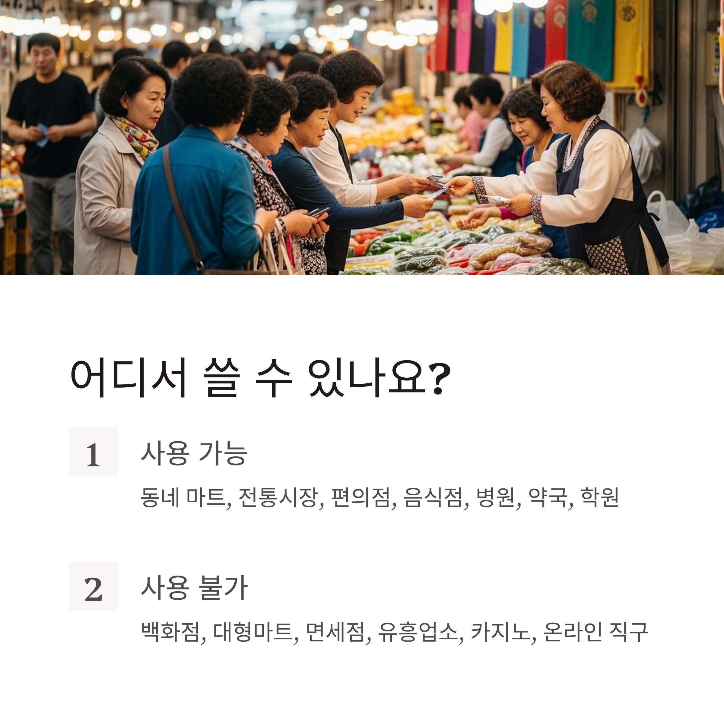 동네 마트, 전통시장, 편의점, 음식점, 병원, 약국, 학원 등