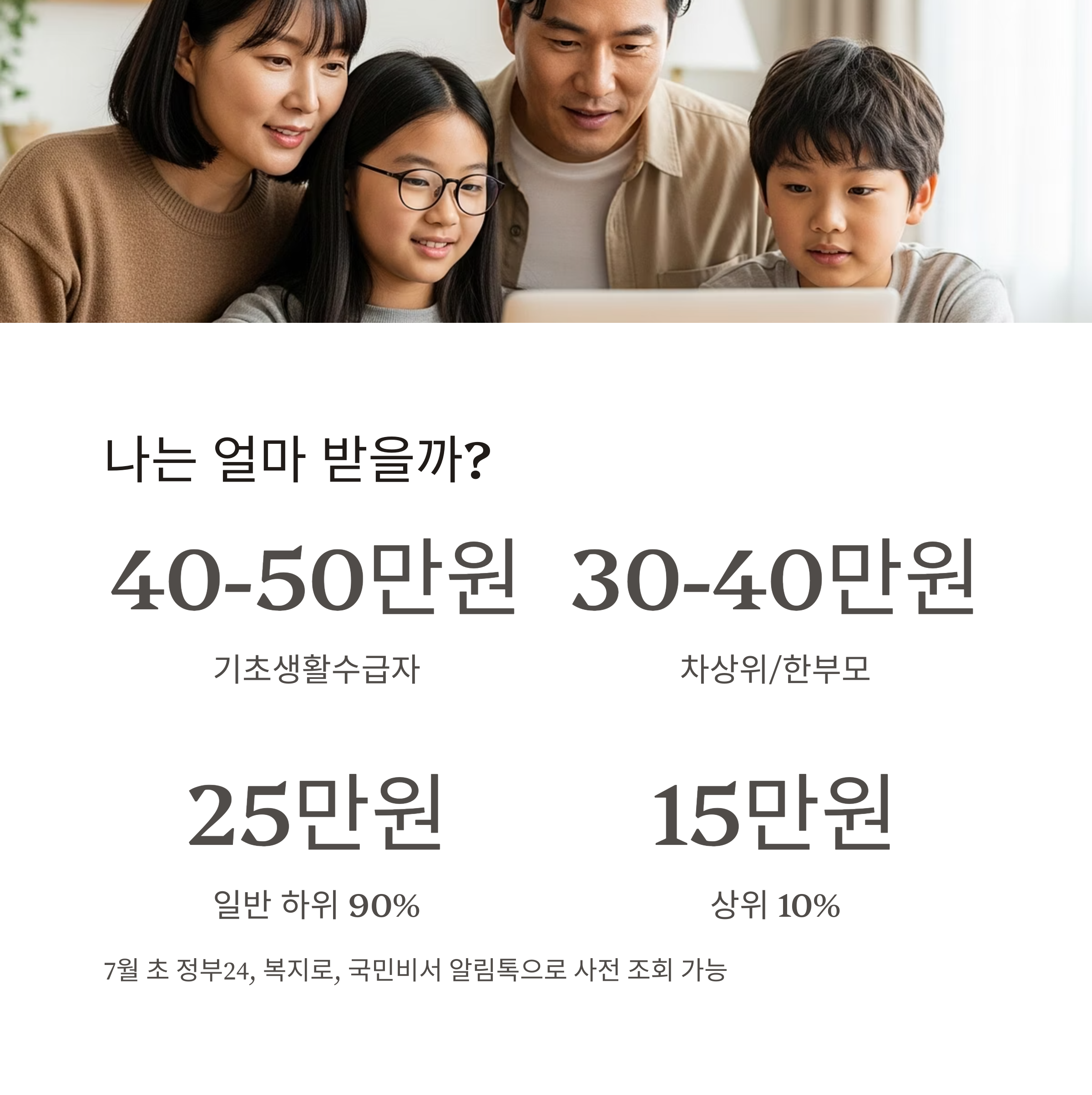 | 일반 국민 (하위 90%) | 15만 원 | +10만 원 | 25만 원 | 소득 기준 충족 시 지급 |