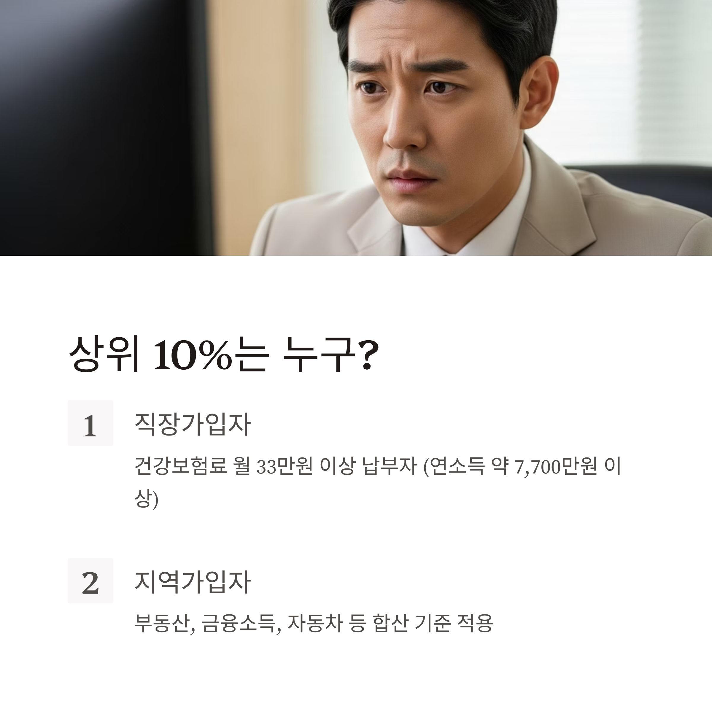 건강보험료 기준으로 월 33만 원 이상 납부 시 상위 10% 추정