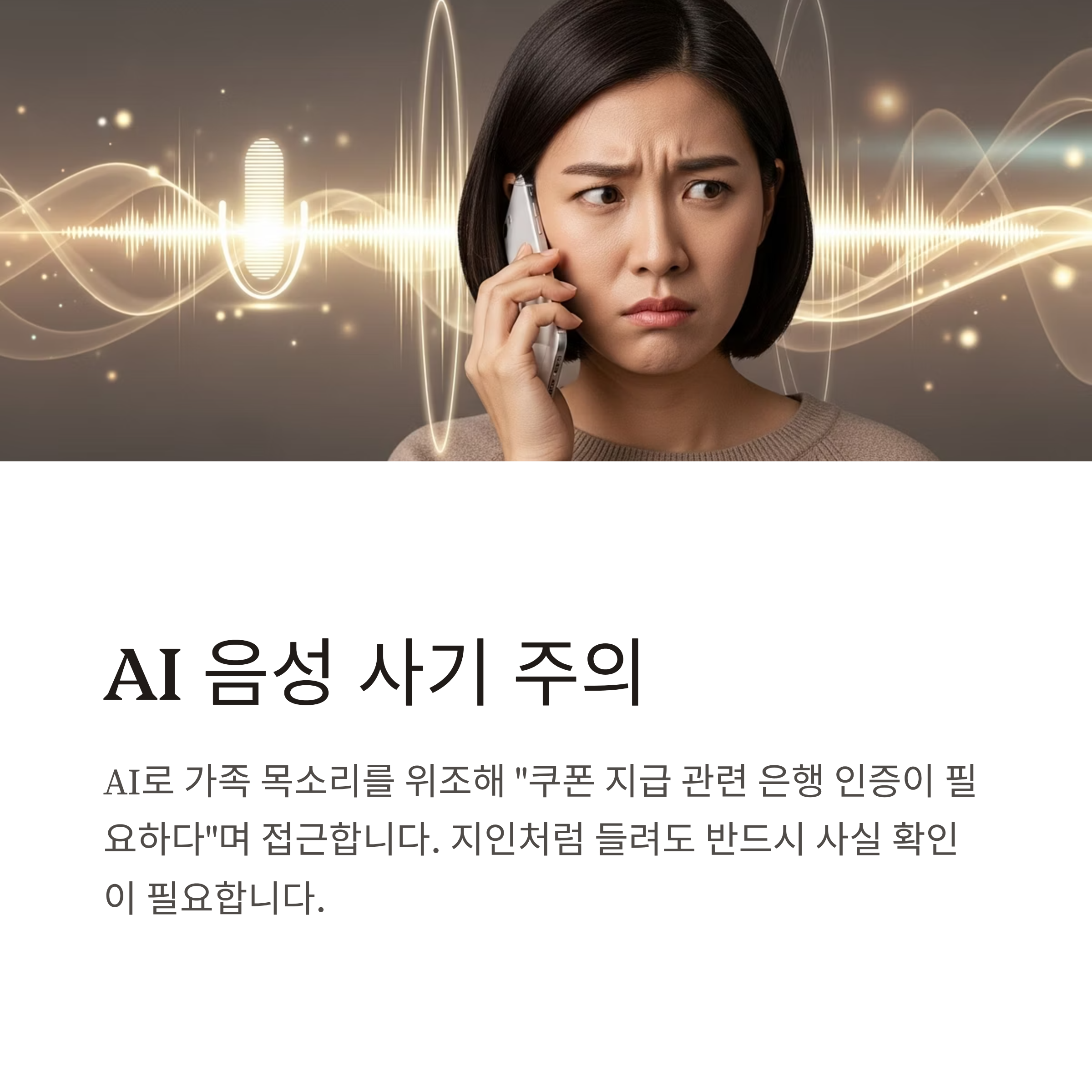 AI 보이스피싱이 결합된 사례도 등장하고 있습니다. 예를 들어 “딸 목소리”로 위장된 전화가 와서 “쿠폰 지급 관련으로 은행 인증이 필요해”라며 접근하는 방식입니다. 최근에는 AI 음성 위조가 매우 정교해져, 지인이나 가족처럼 들리더라도 반드시 사실 확인 후 대응이 필요합니다.