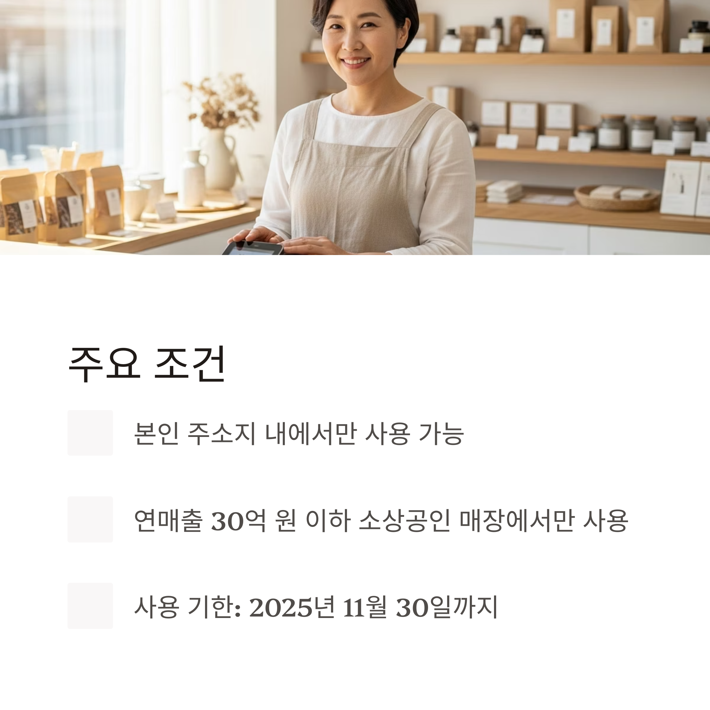 | 사용 조건 | 주소지 내 소상공인 매장(연매출 30억 이하) |