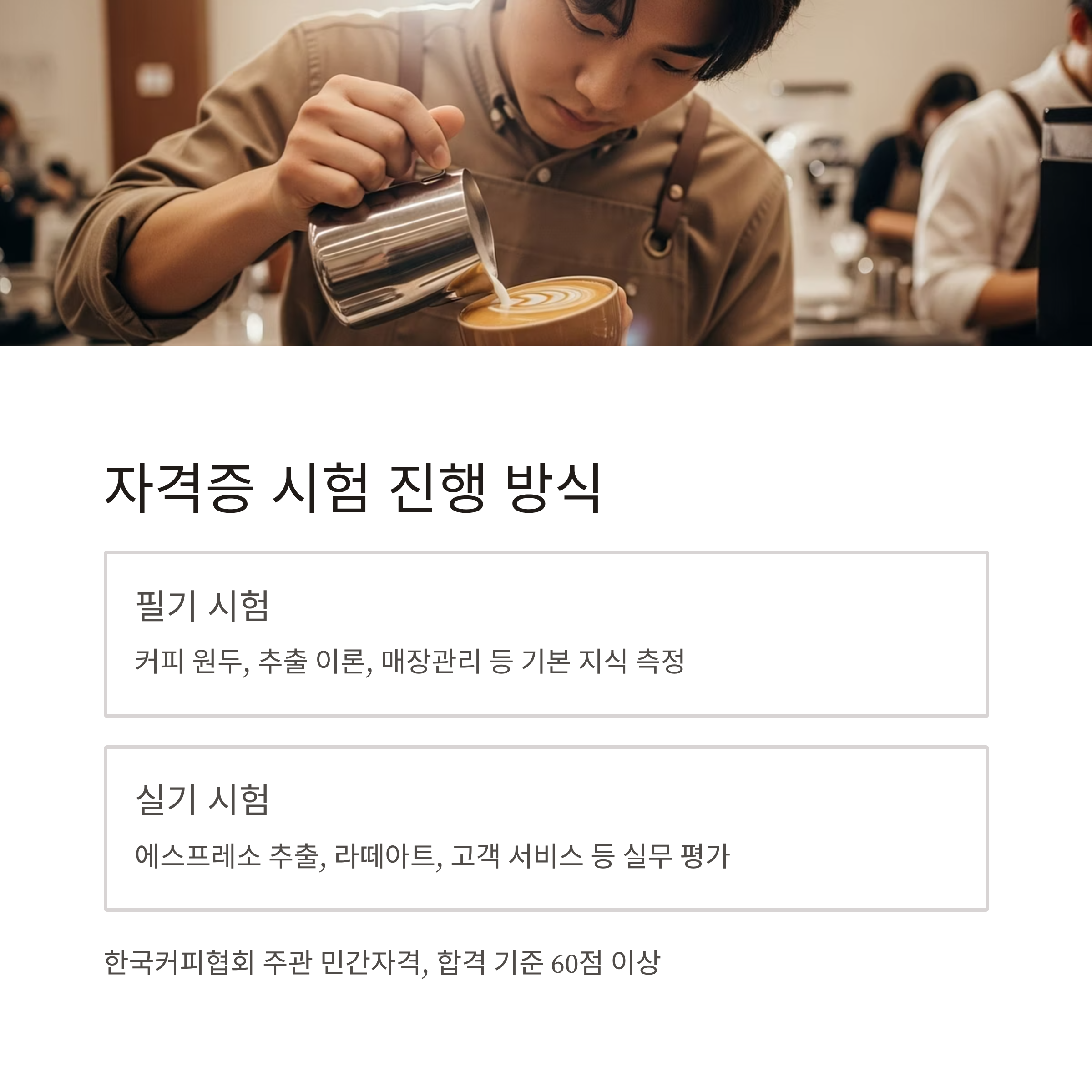 | 필기 시험 | 커피 원두, 추출 이론, 매장관리 등 기본 지식 측정 |