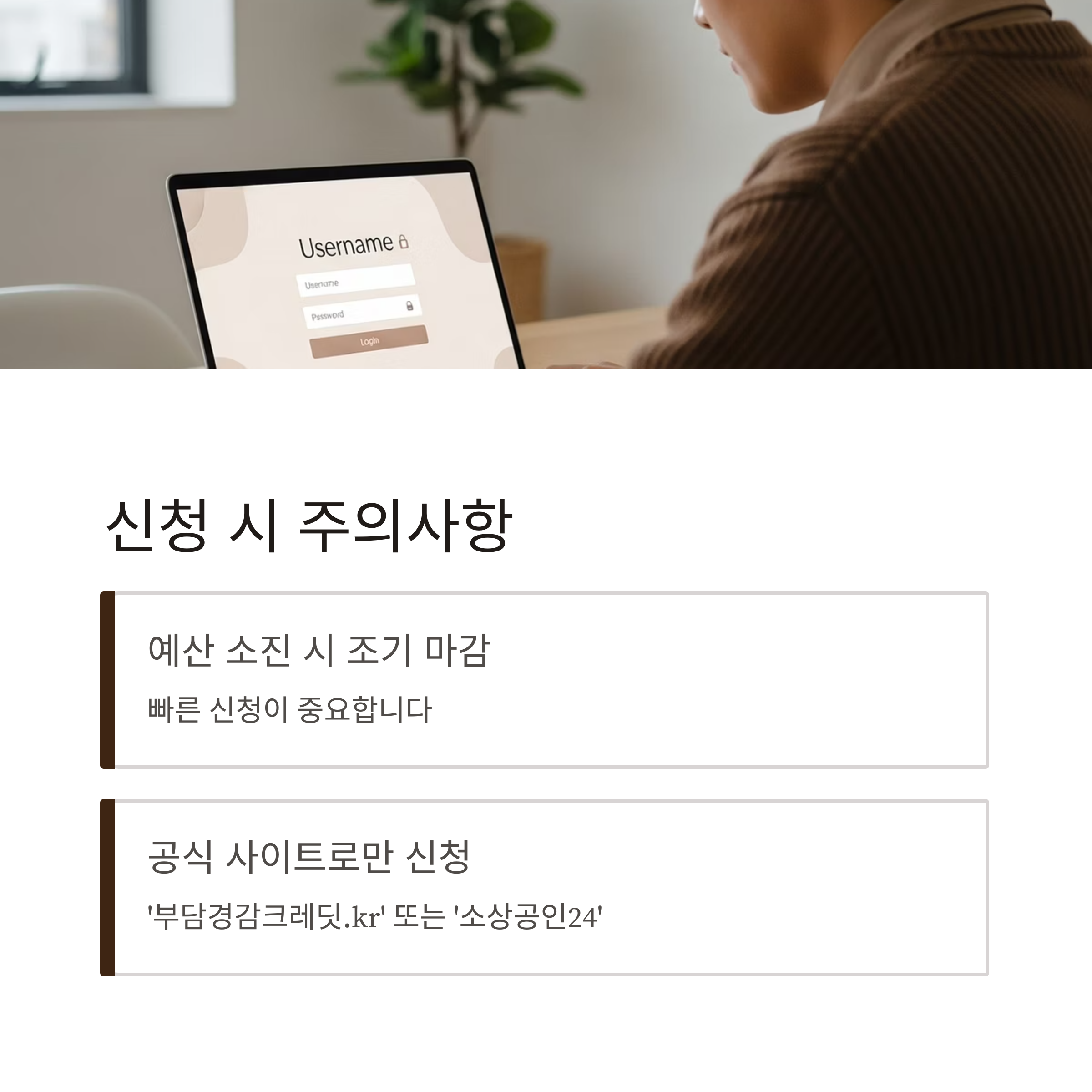 - 피싱 사이트 주의: 신청은 반드시 ‘부담경감크레딧.kr’ 또는 ‘소상공인24’를 통해 진행