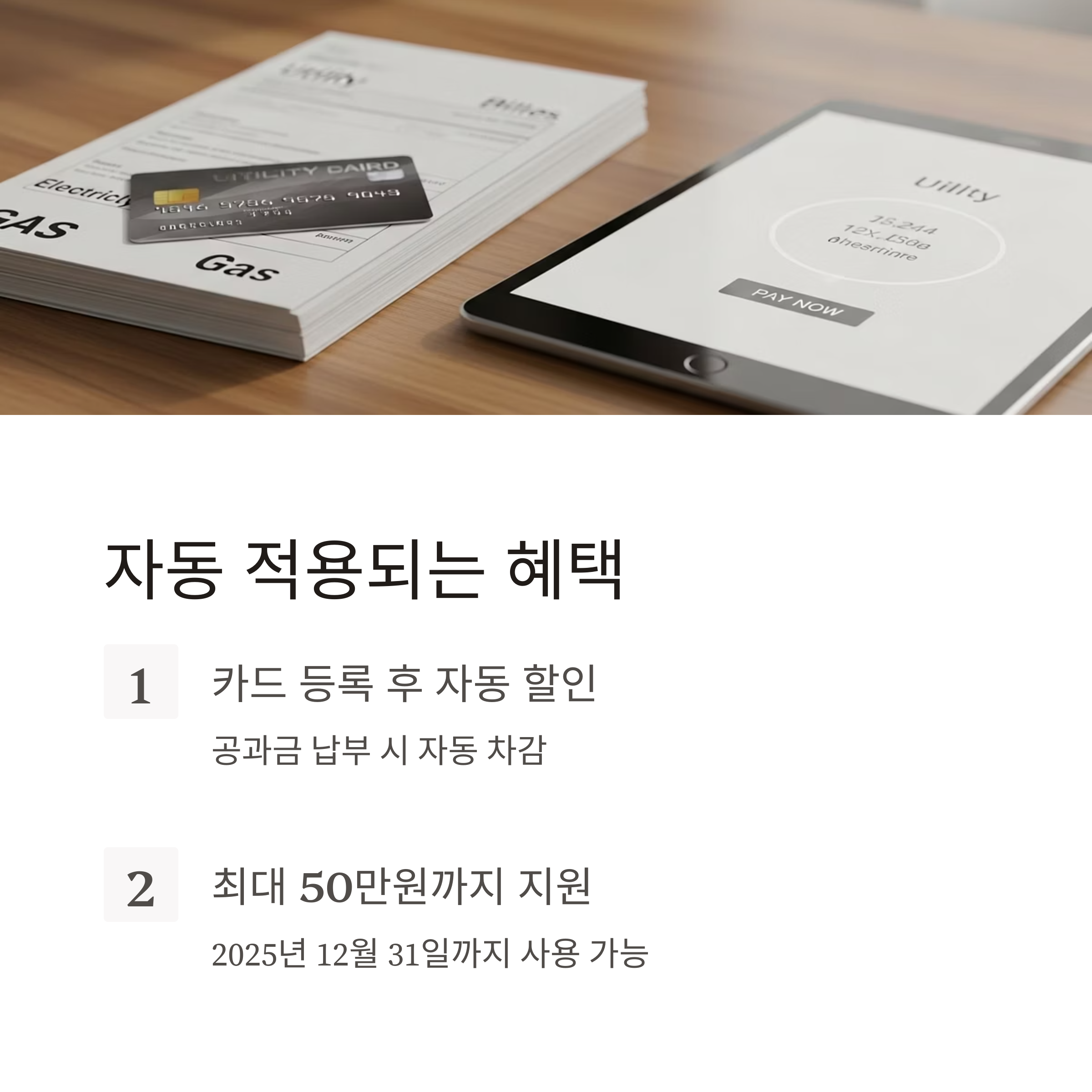- 신청 후 카드 등록 완료 시점부터 공과금 납부 금액이 자동 할인 적용