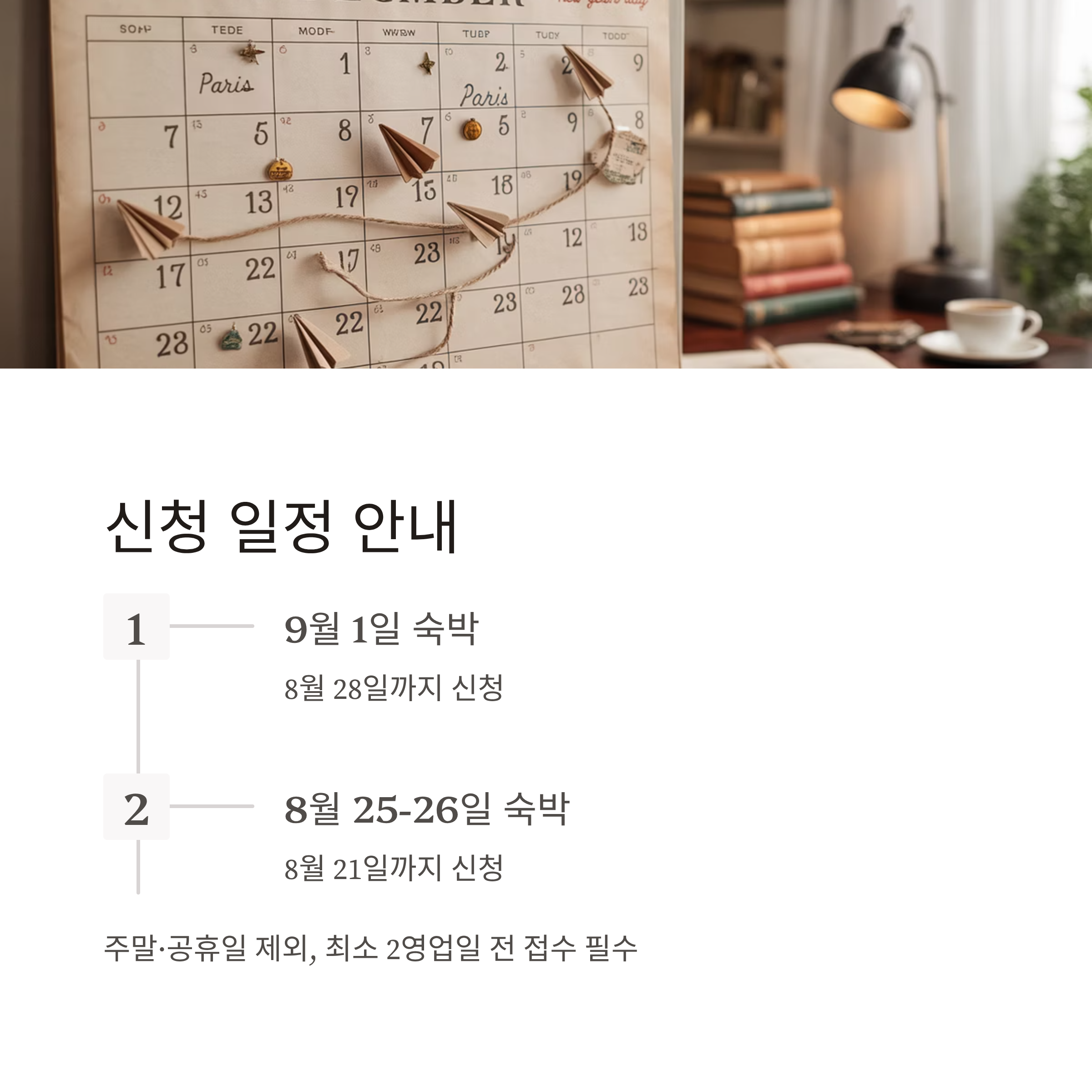 | 신청 시점 | 숙박일 기준 2일 전까지 신청 완료 (주말·공휴일 제외) |