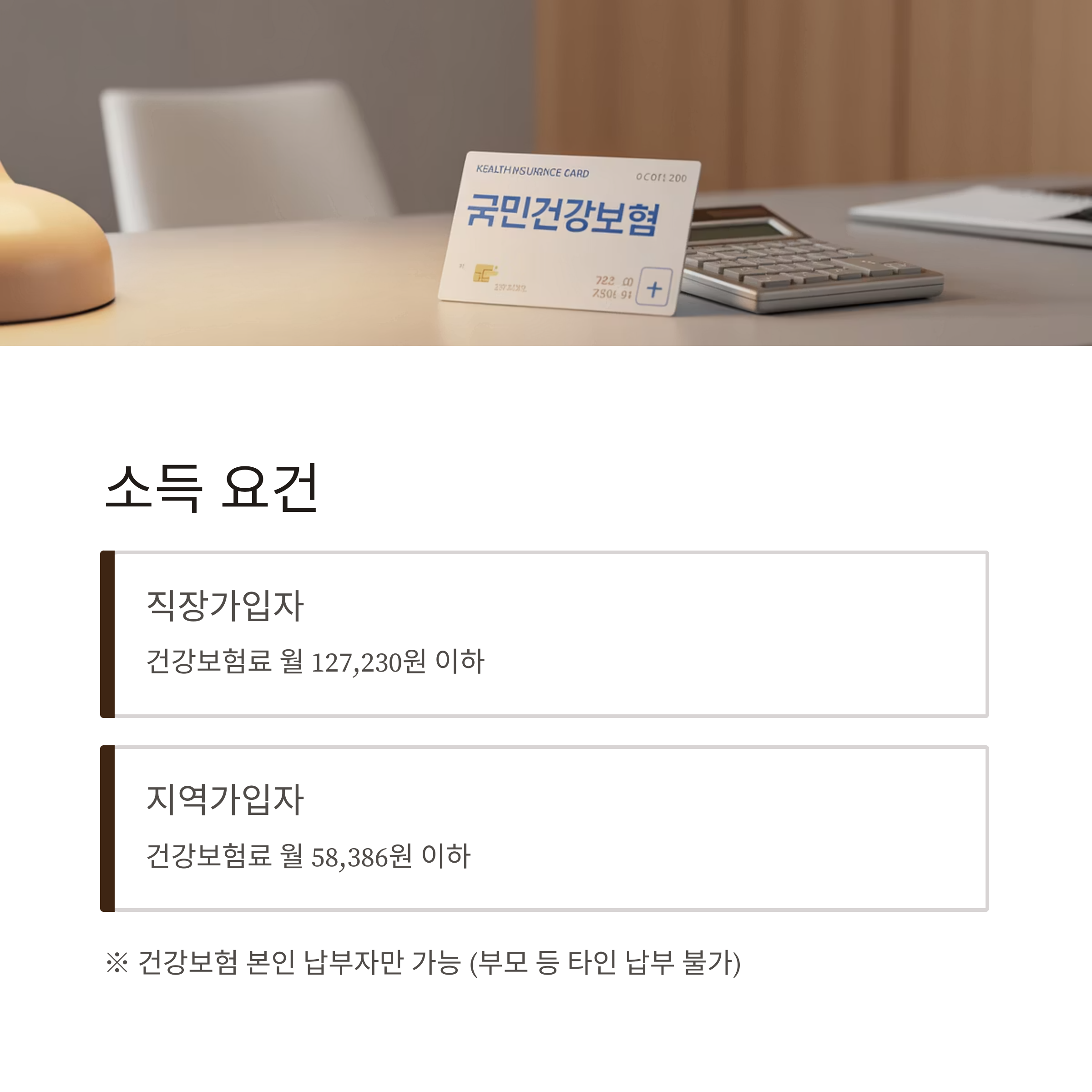 지역가입자 월 58,386원 이하 - 건강보험 본인 납부자일 것 (부모 등 타인 납부자 불가)