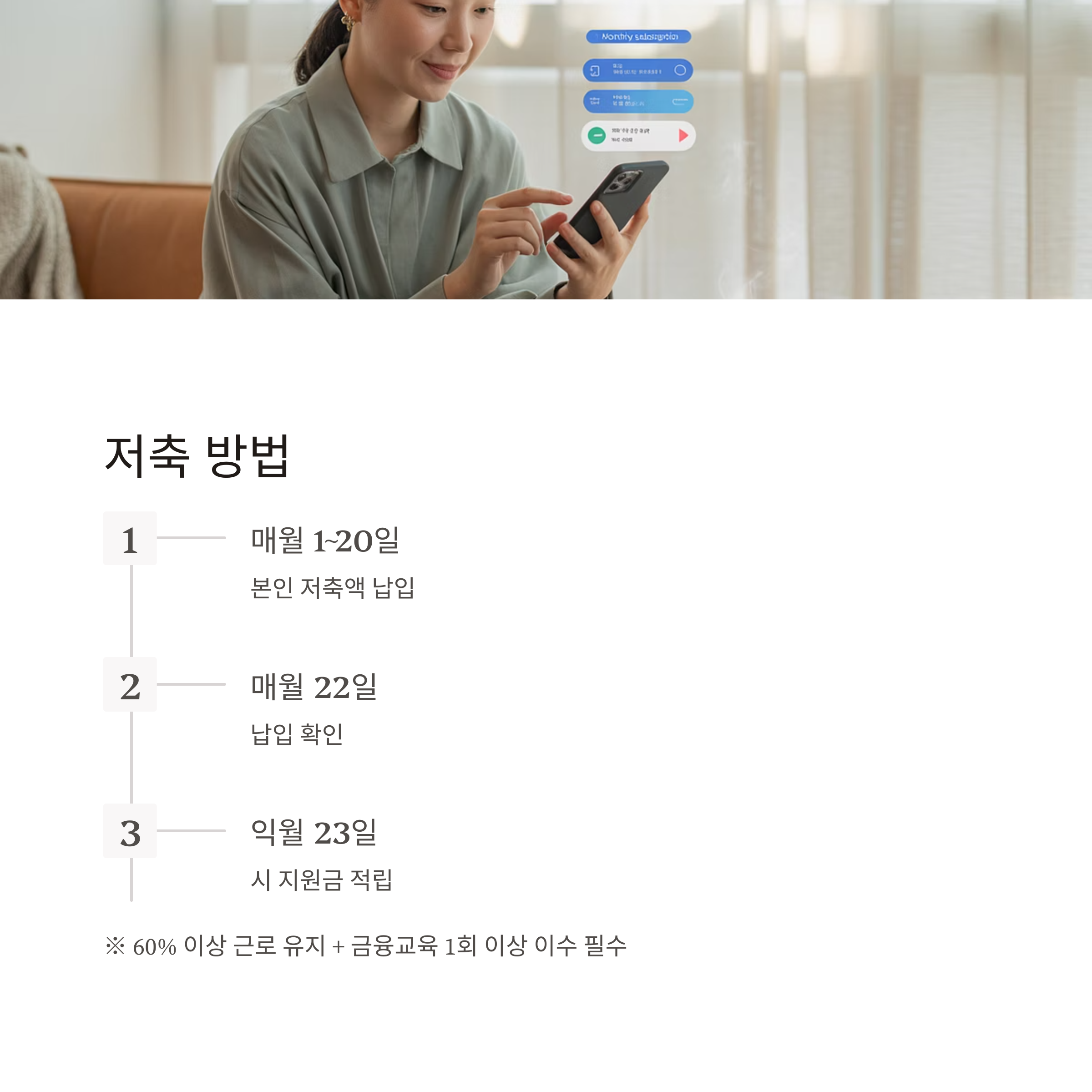납입 일정 | 매달 1일~20일 사이 본인 저축 납입 |