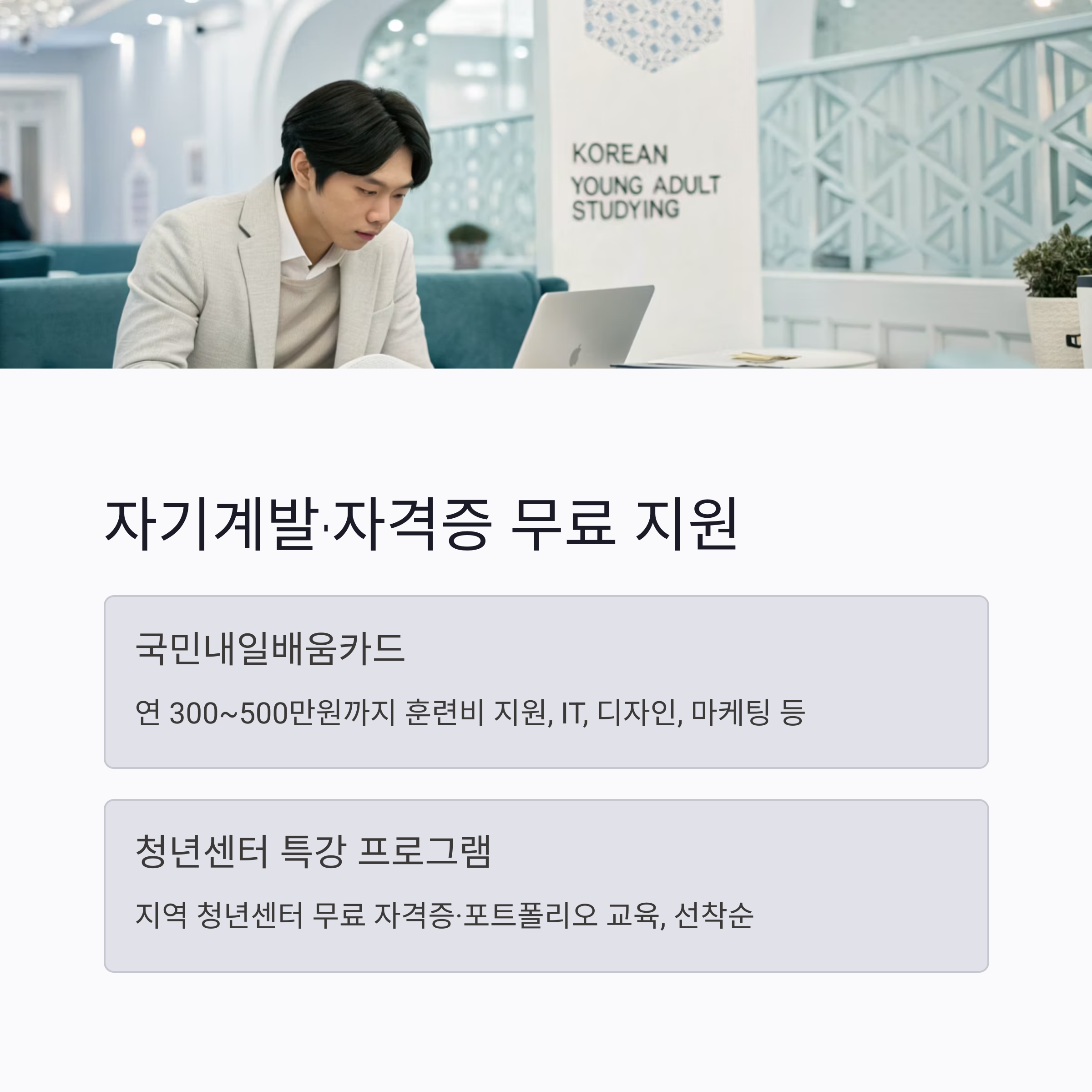 | 청년센터 특강 프로그램 | 지역 청년센터에서 제공하는 자격증·포트폴리오 교육 무료 진행 | 대부분 선착순, 지역별 공지 필수 확인 |
