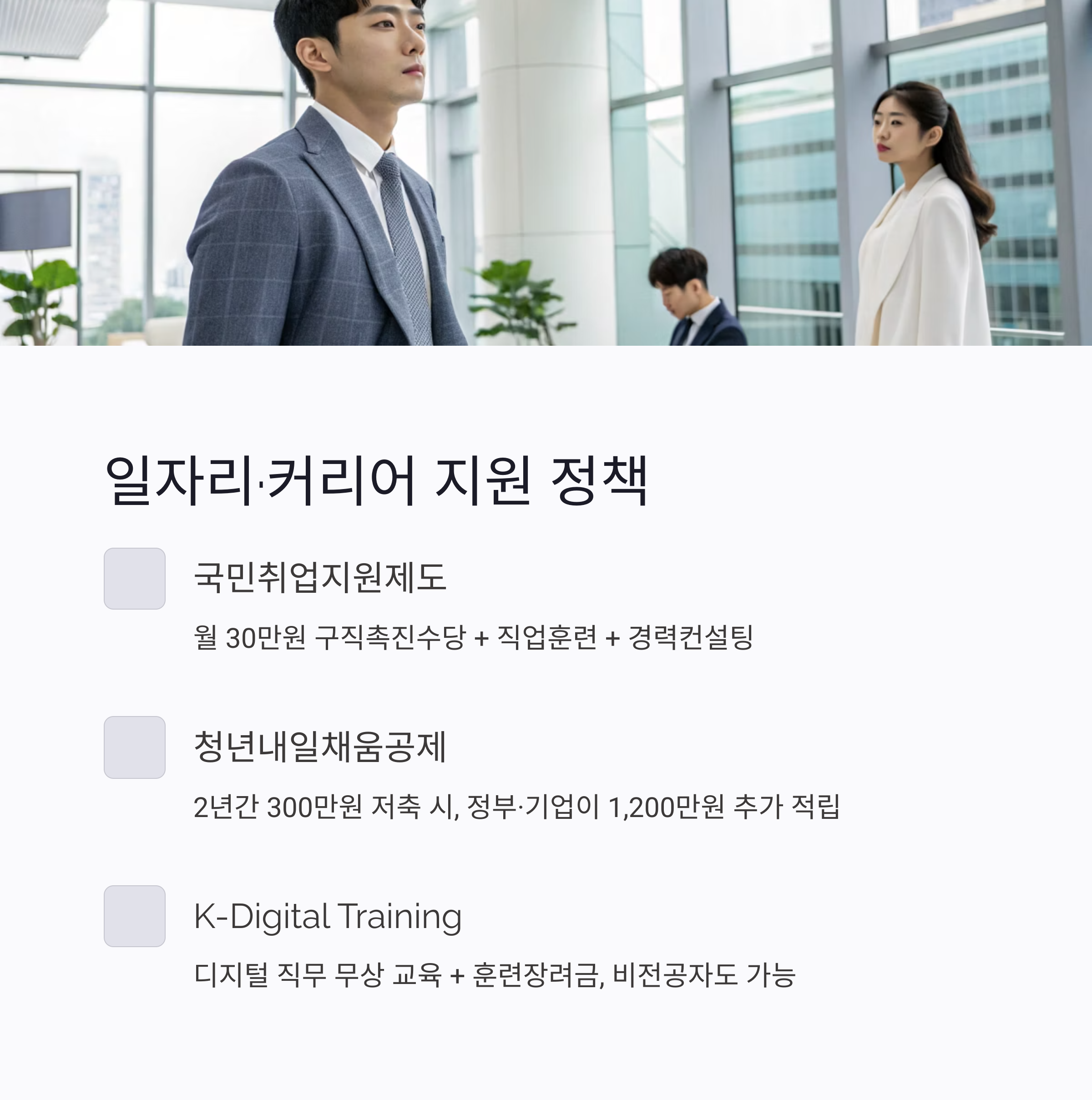 | 청년내일채움공제 | 중소기업 재직 청년이 2년간 300만 원 저축 시, 정부·기업이 1,200만 원 추가 적립 | 정규직 1년 이상 재직 청년 |
