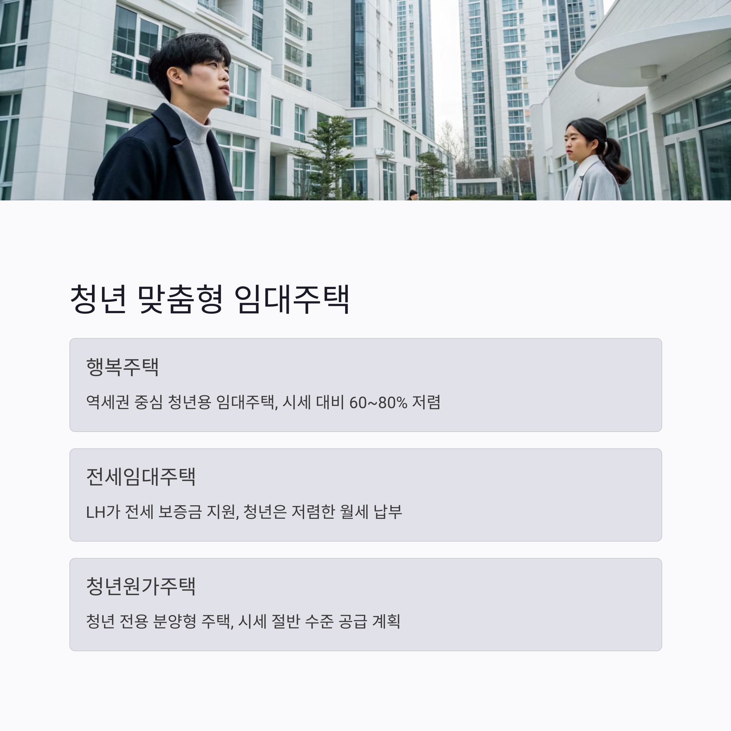 | 행복주택 | 역세권·대중교통 중심지에 청년용 임대주택 공급 | 시세 대비 60~80% 저렴 |