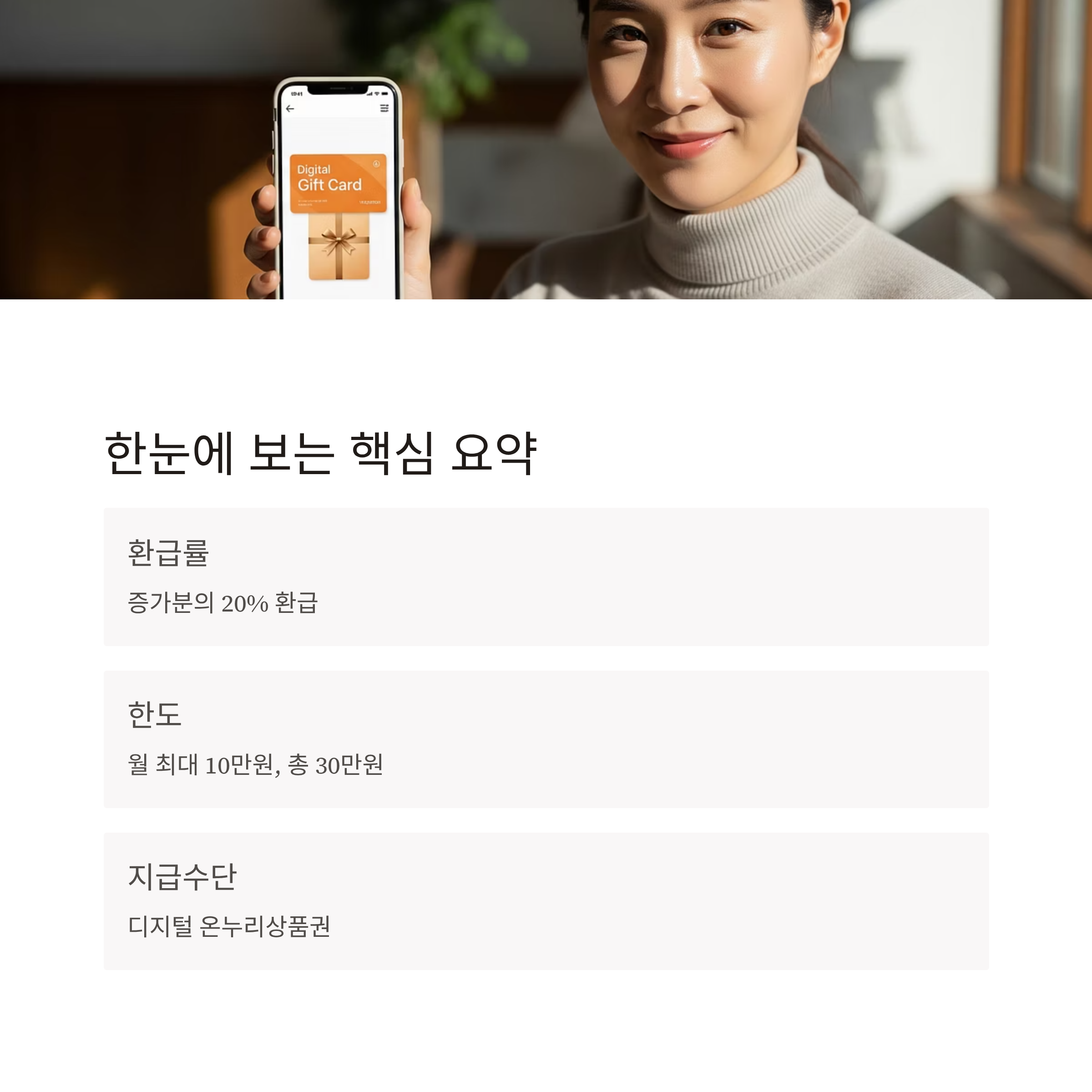2025년 9월부터 11월까지의 카드 사용이 2024년 본인 월평균 대비 증가하면 증가분의 20퍼센트를 환급합니다. 월 최대 10만 원, 총 3개월 최대 30만 원 한도입니다. 환급 수단은 디지털 온누리상품권으로 지급되며 누리집에서 본인인증만 하면 신청이 완료됩니다.