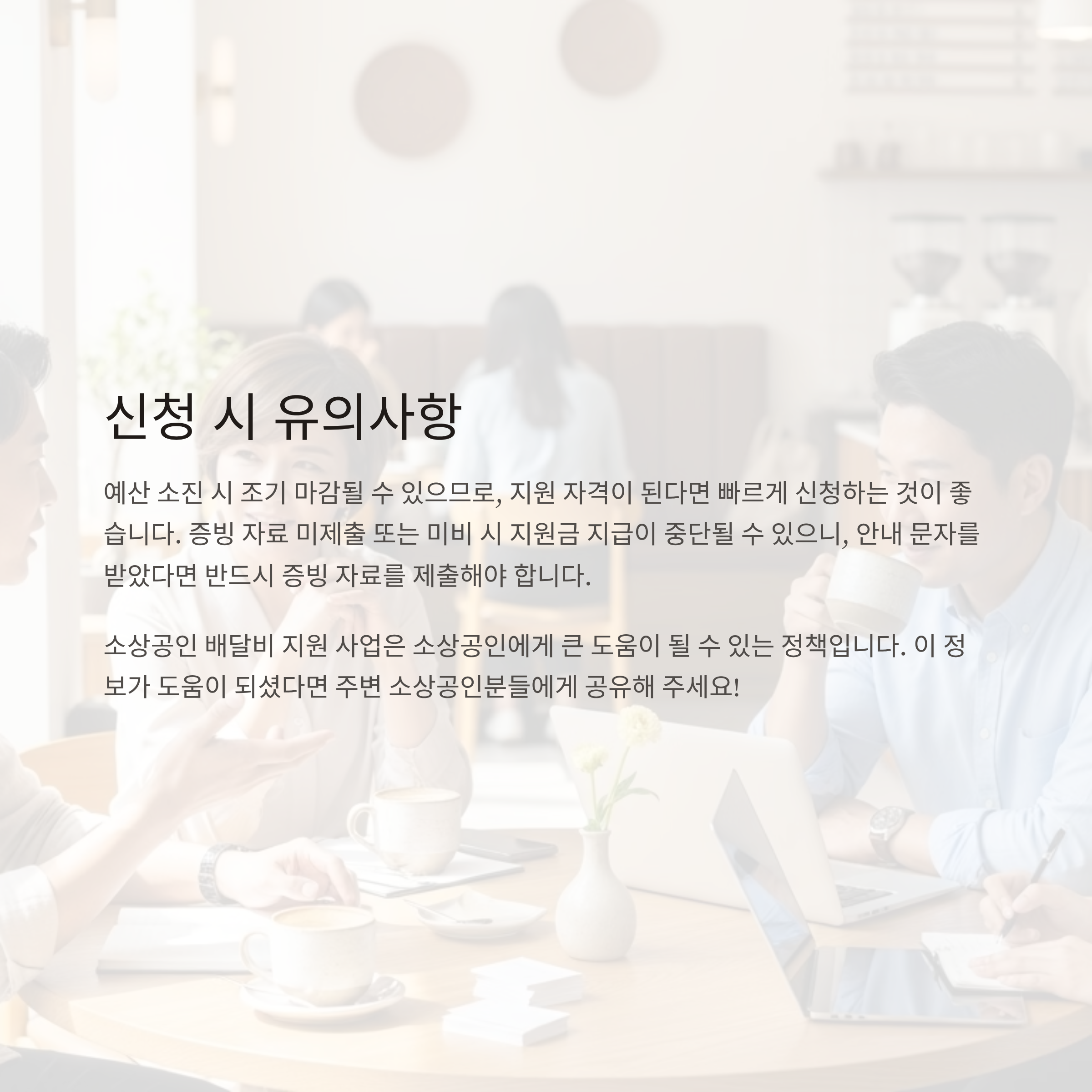소상공인 배달비 지원 사업은 소상공인에게 큰 도움이 될 수 있는 정책이므로, 본인의 상황에 맞는 유형을 확인하시고 필요한 서류를 준비하여 신청하시길 바랍니다.