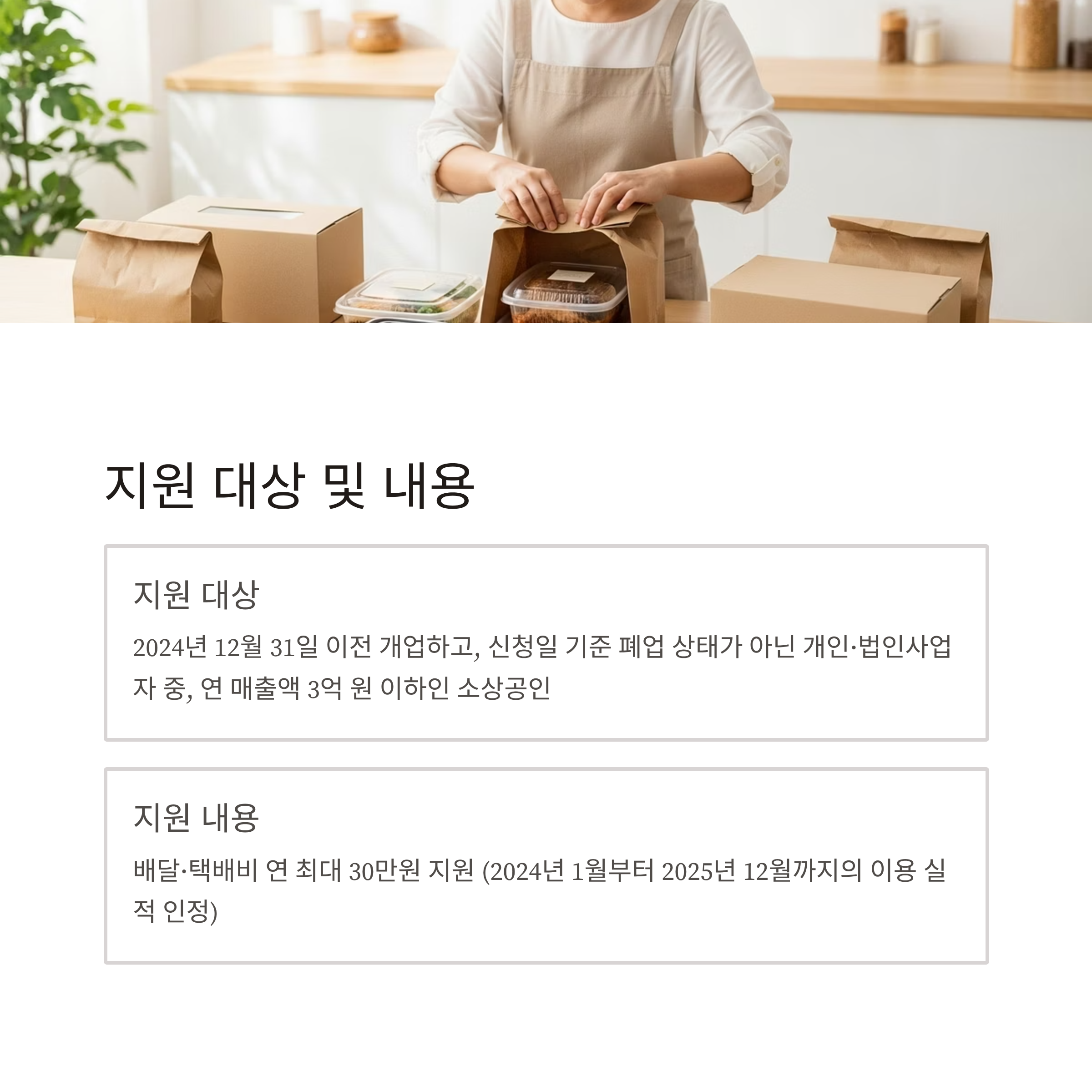 - 지원 내용: 배달·택배비 연 최대 30만원 지원 (2024년 1월부터 2025년 12월까지의 이용 실적 인정)
