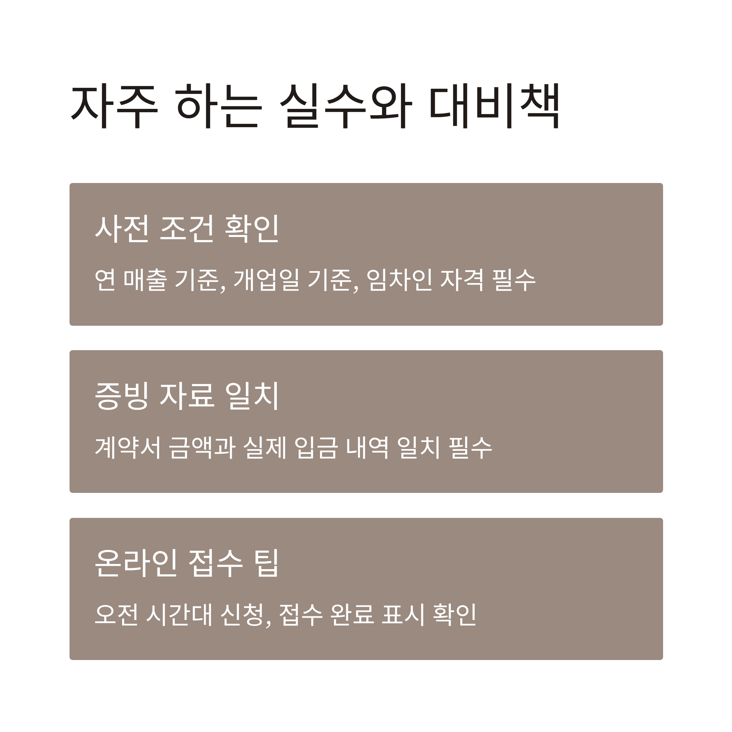 | 💡 추천 준비 순서 | ① 소상공인확인서 발급 → ② 임대료 증빙 자료 정리 → ③ 공고문 조건 재확인 |