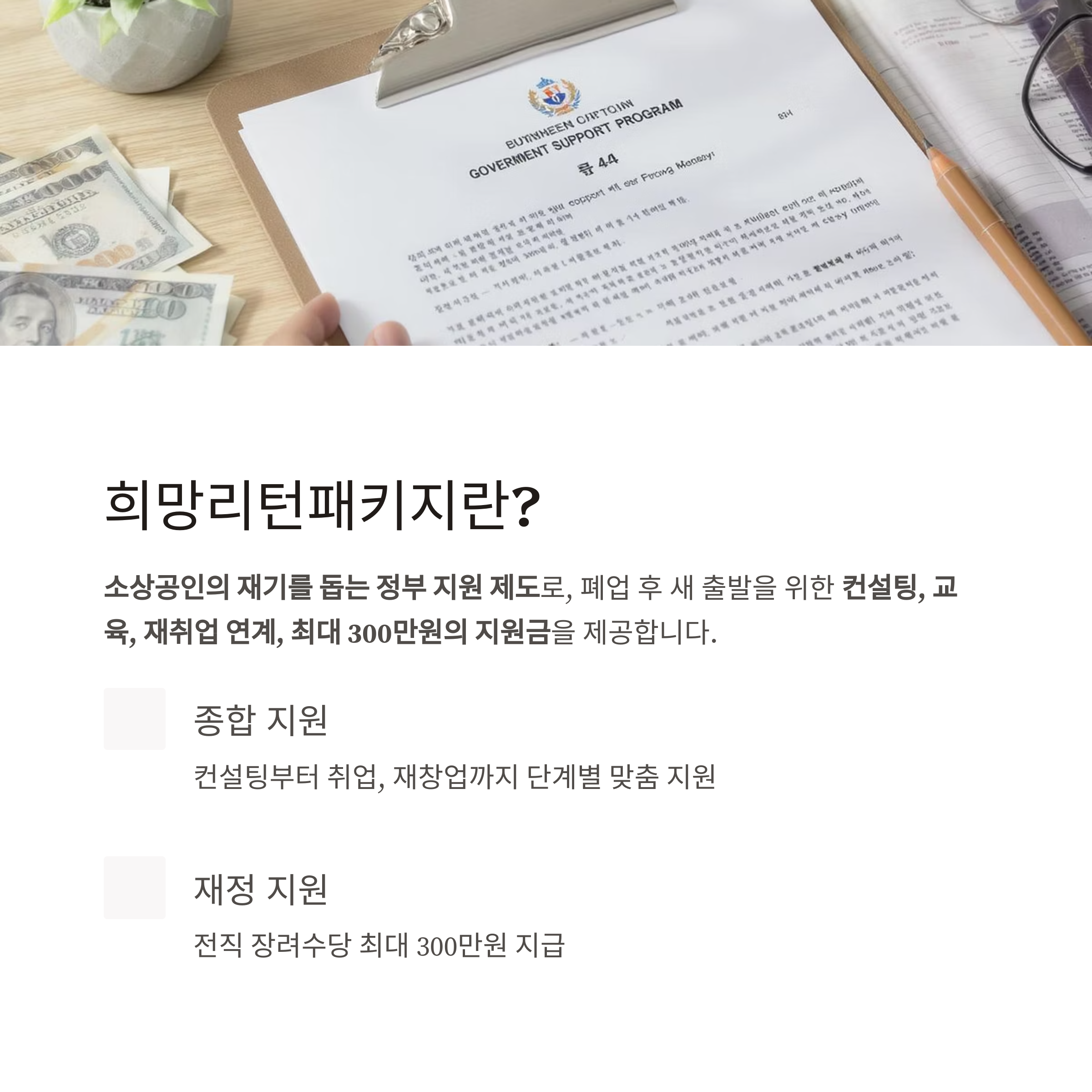 컨설팅, 교육, 재취업 연계, 최대 300만원의 지원금까지 제공하는 종합 프로그램입니다.