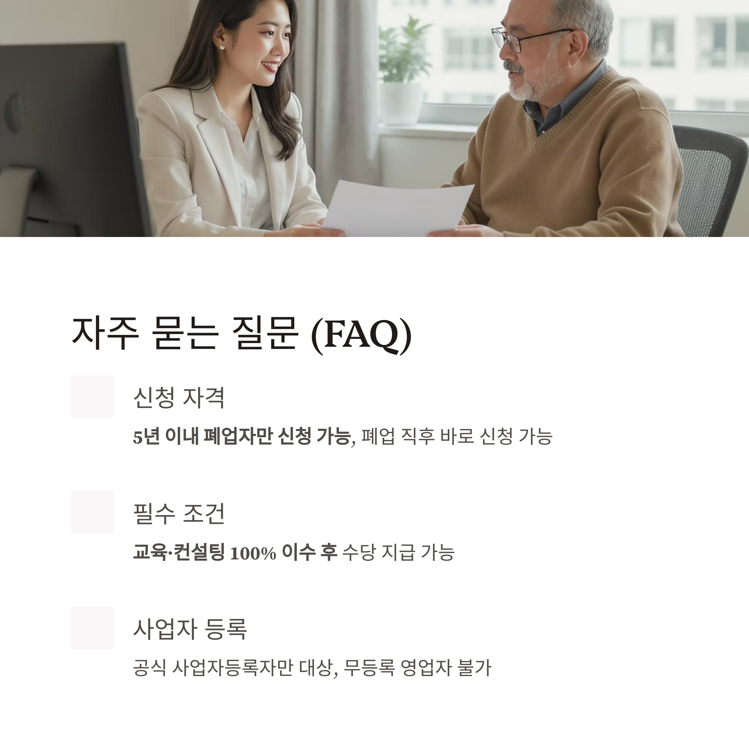 | 사업자등록은 없었지만 장사를 했던 경우도 가능한가요? | 불가능합니다. 폐업 증빙이 가능한 공식 사업자등록자만 대상 |
