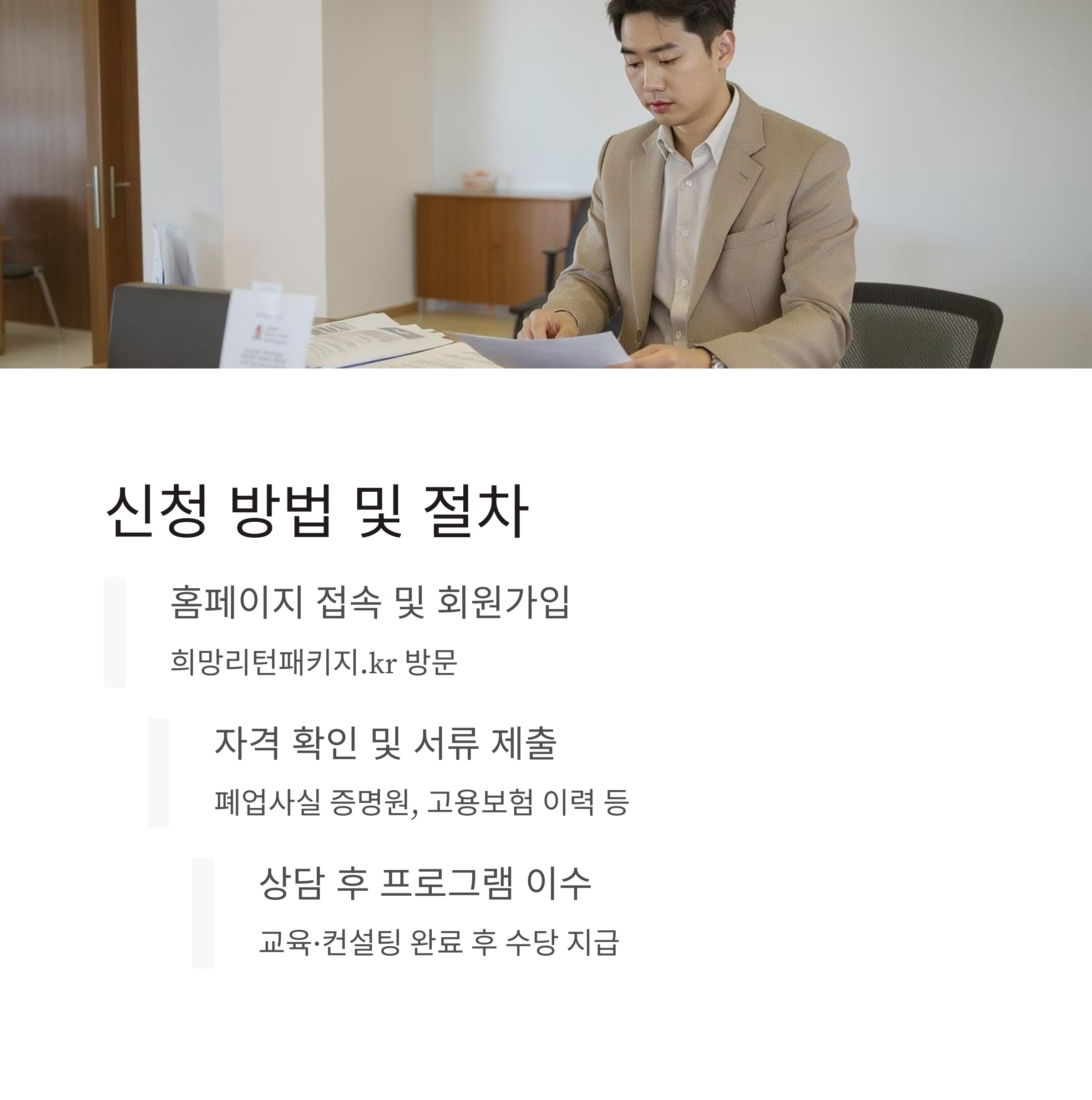 단순 지원금이 아니라 취업과 재창업을 위한 단계별 맞춤형 설계가 핵심입니다.