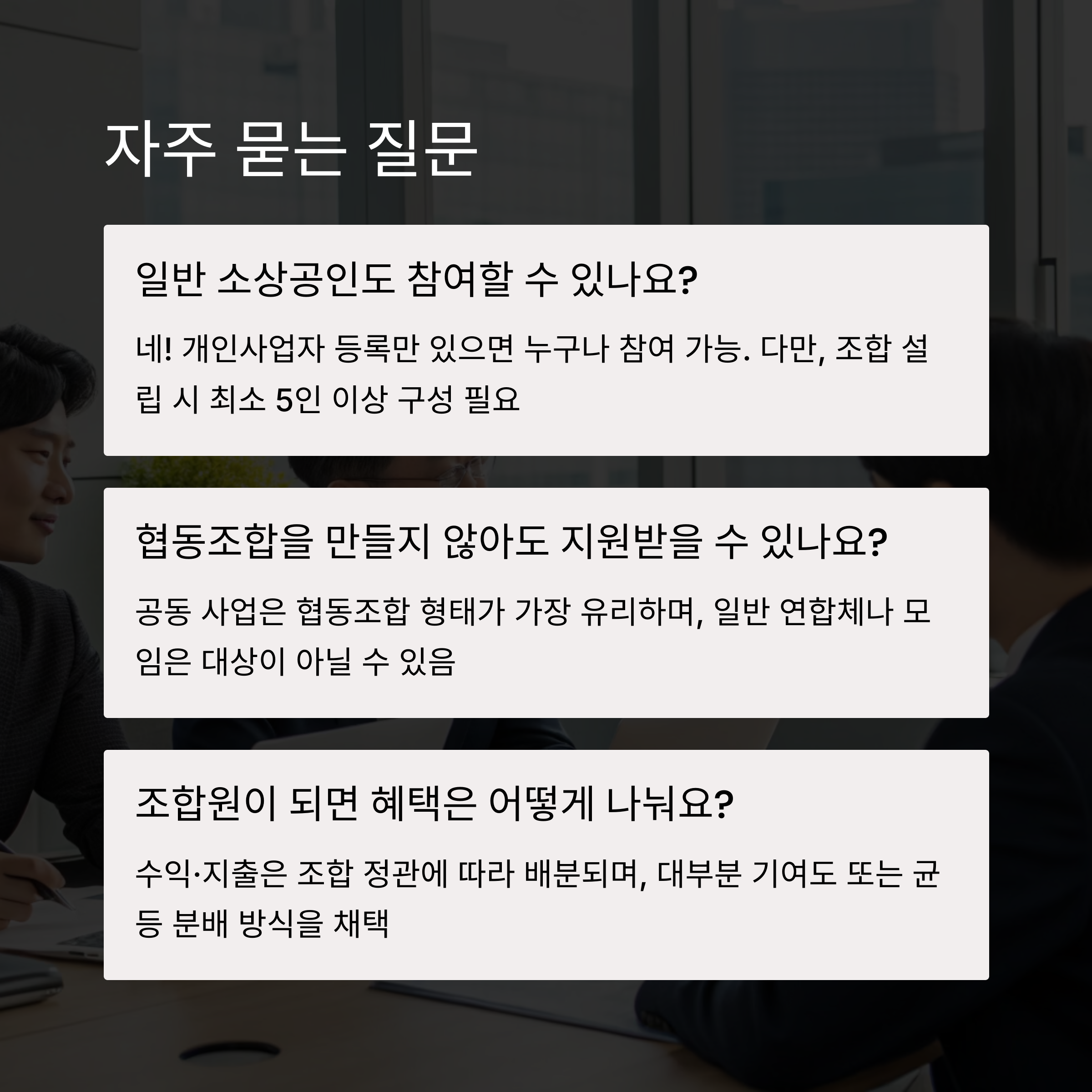 | 설립 조건 | 최소 5인 이상의 소상공인이 모여 조합 형태 설립 |
