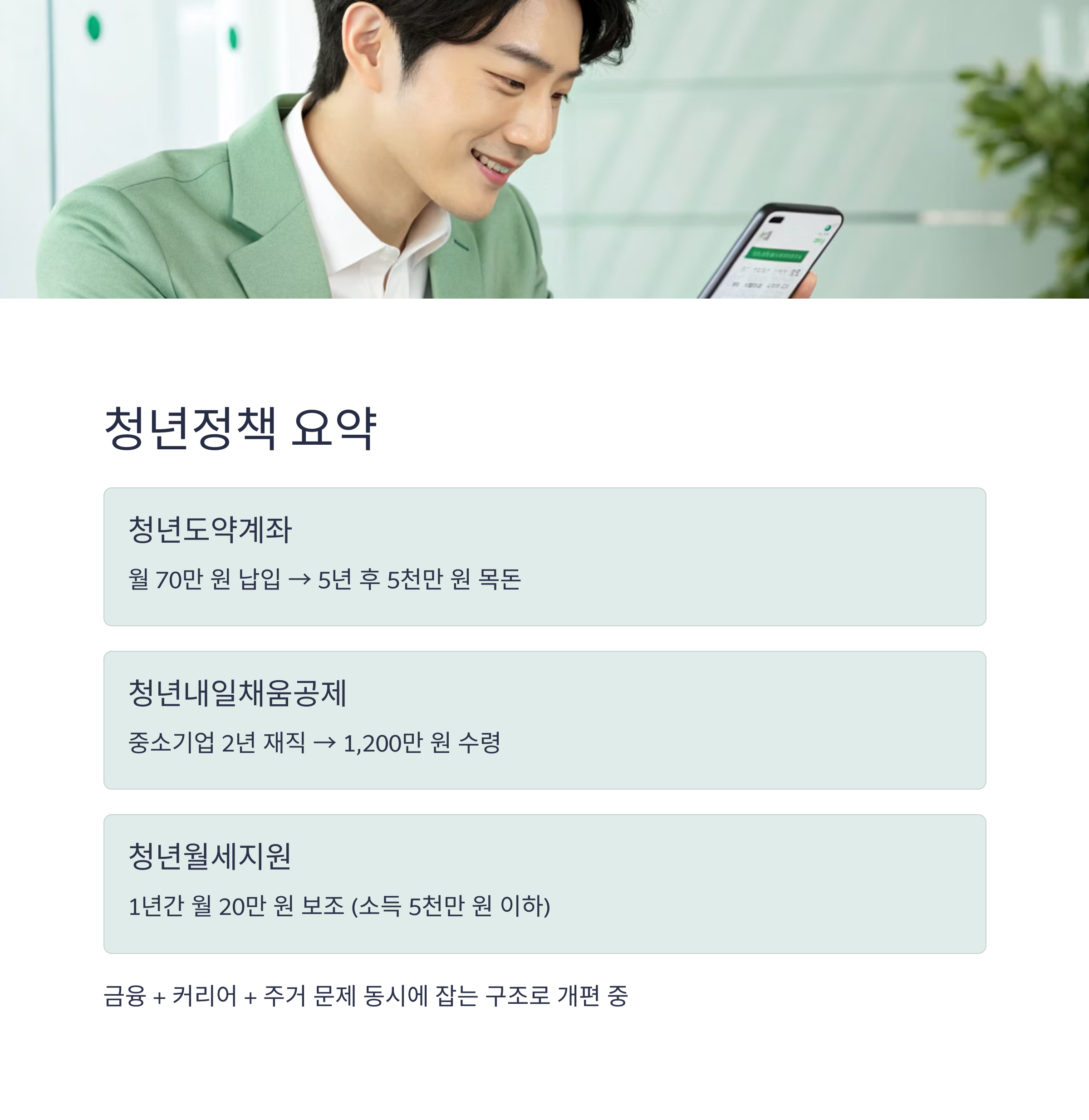 🧾 4. 청년정책 요약 – 일자리·저축·주거 세 박자