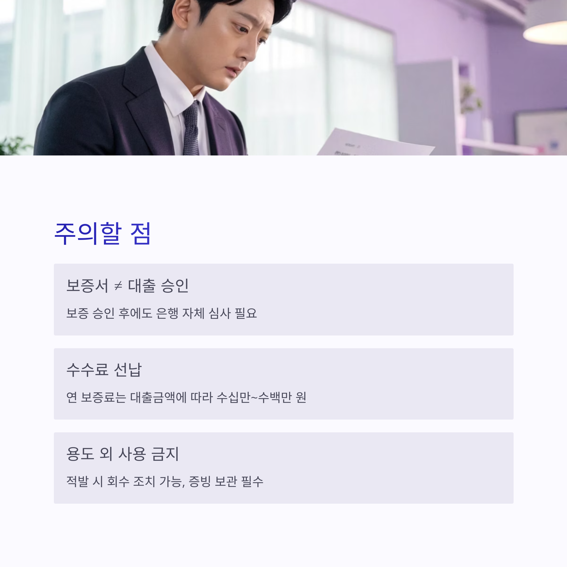 → 연 보증료는 대출금액에 따라 수십만~수백만 원까지 발생 - 대출금 용도 외 사용 적발 시 회수 조치 가능