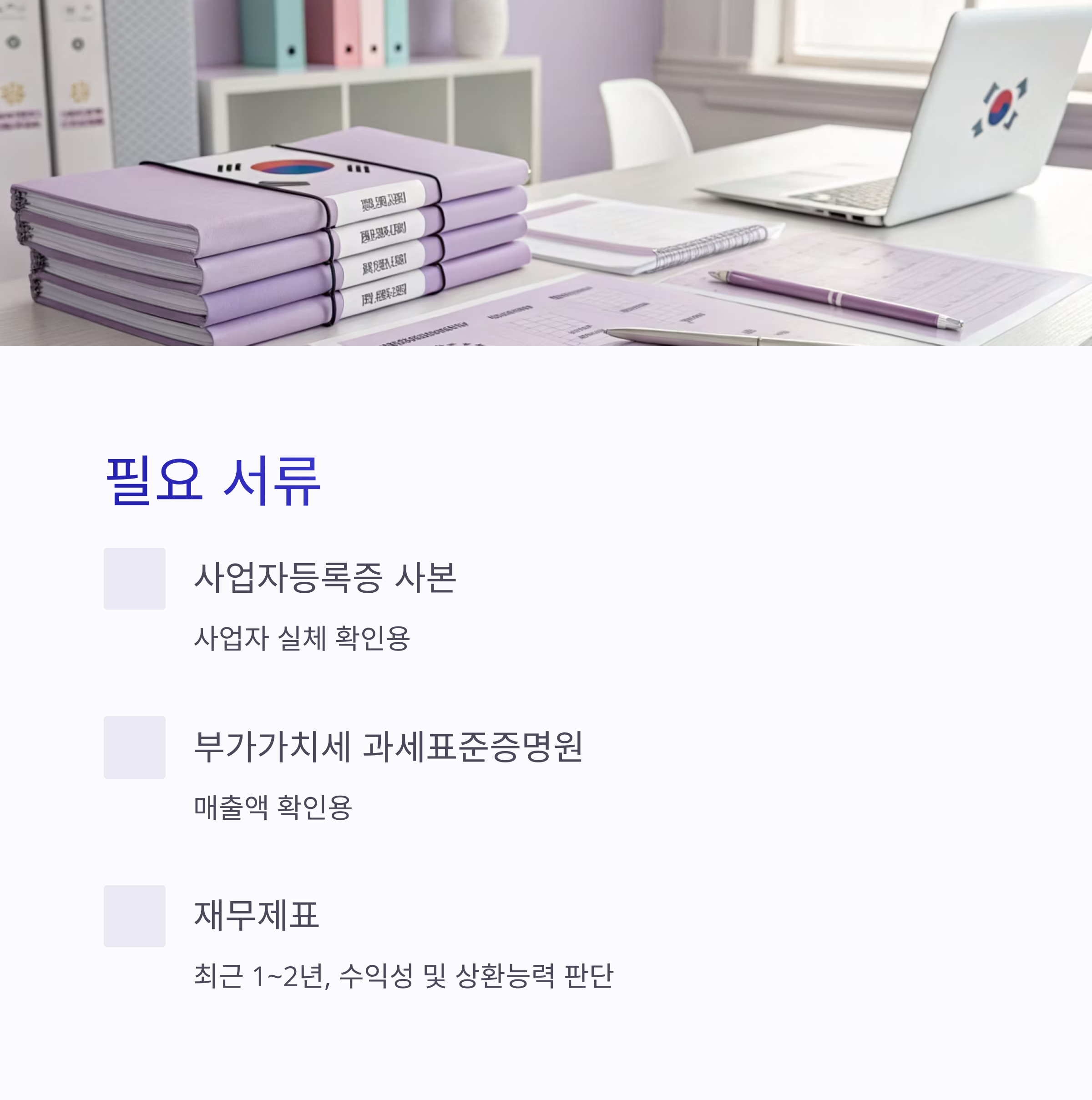 - 사업자등록증, 부가세 신고서, 매출자료 등 제출