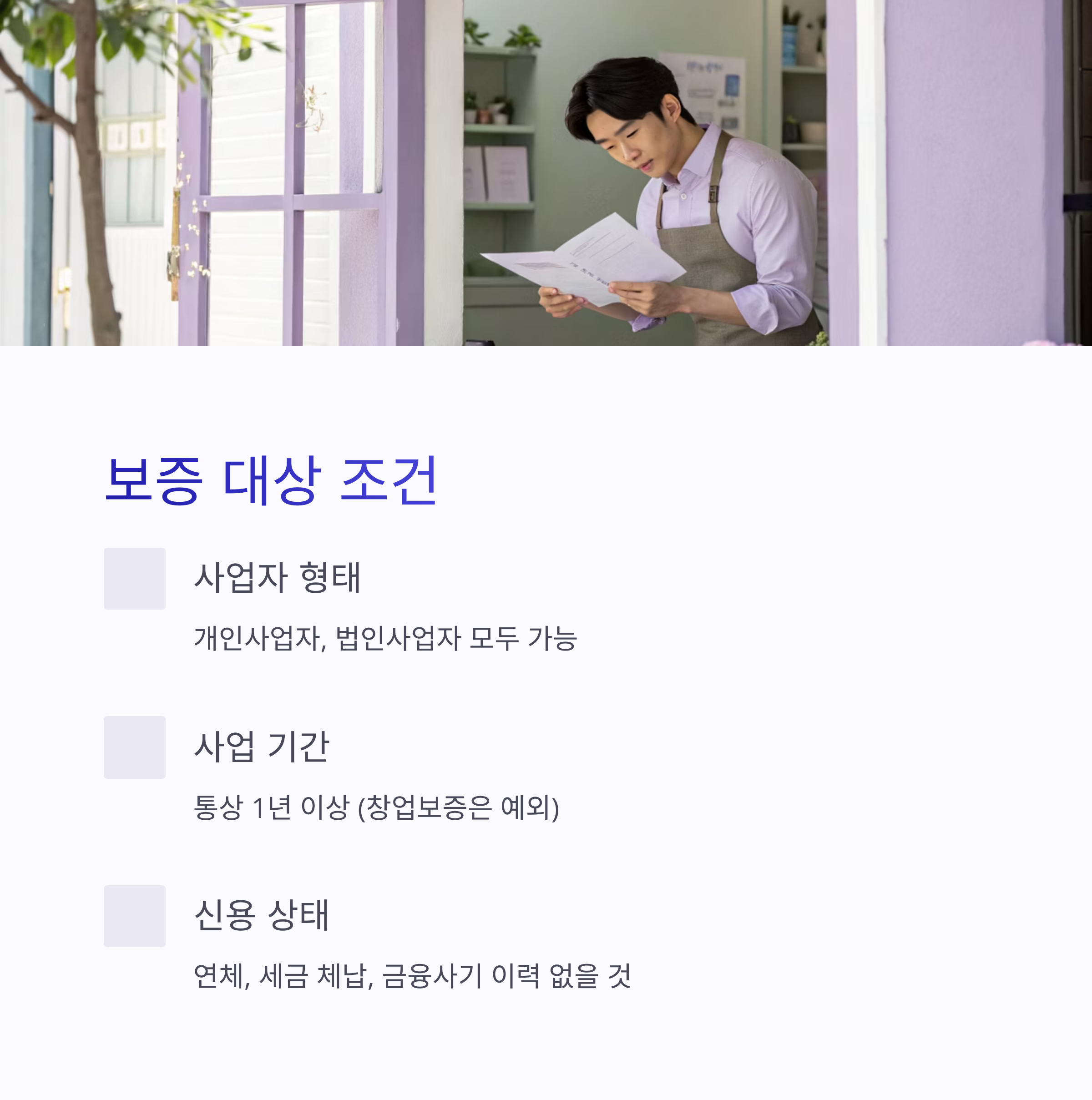 | 보증 대상 | 중소기업, 자영업자, 창업자 |