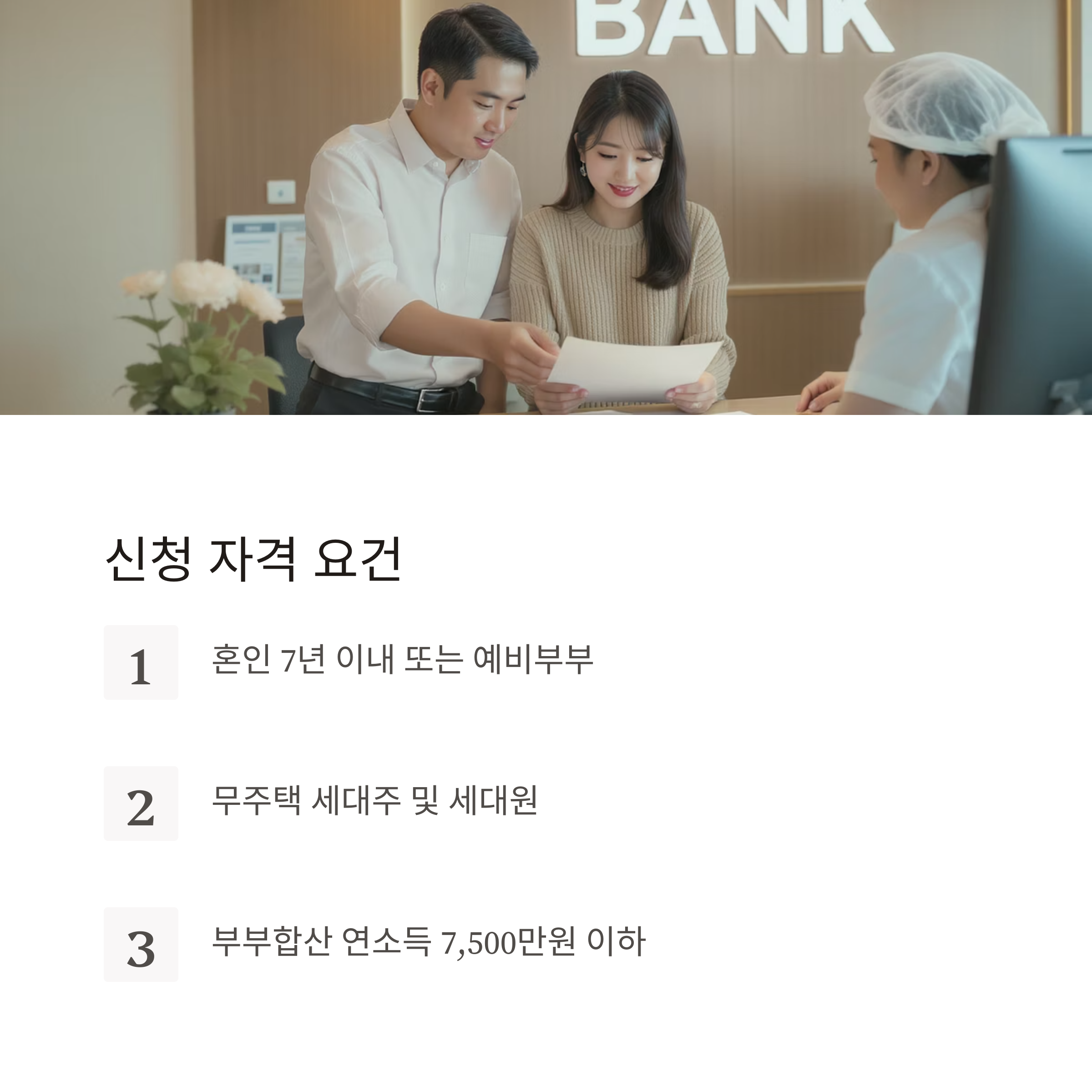 - 혼인신고 기준 7년 이내 신혼부부 또는 예비부부