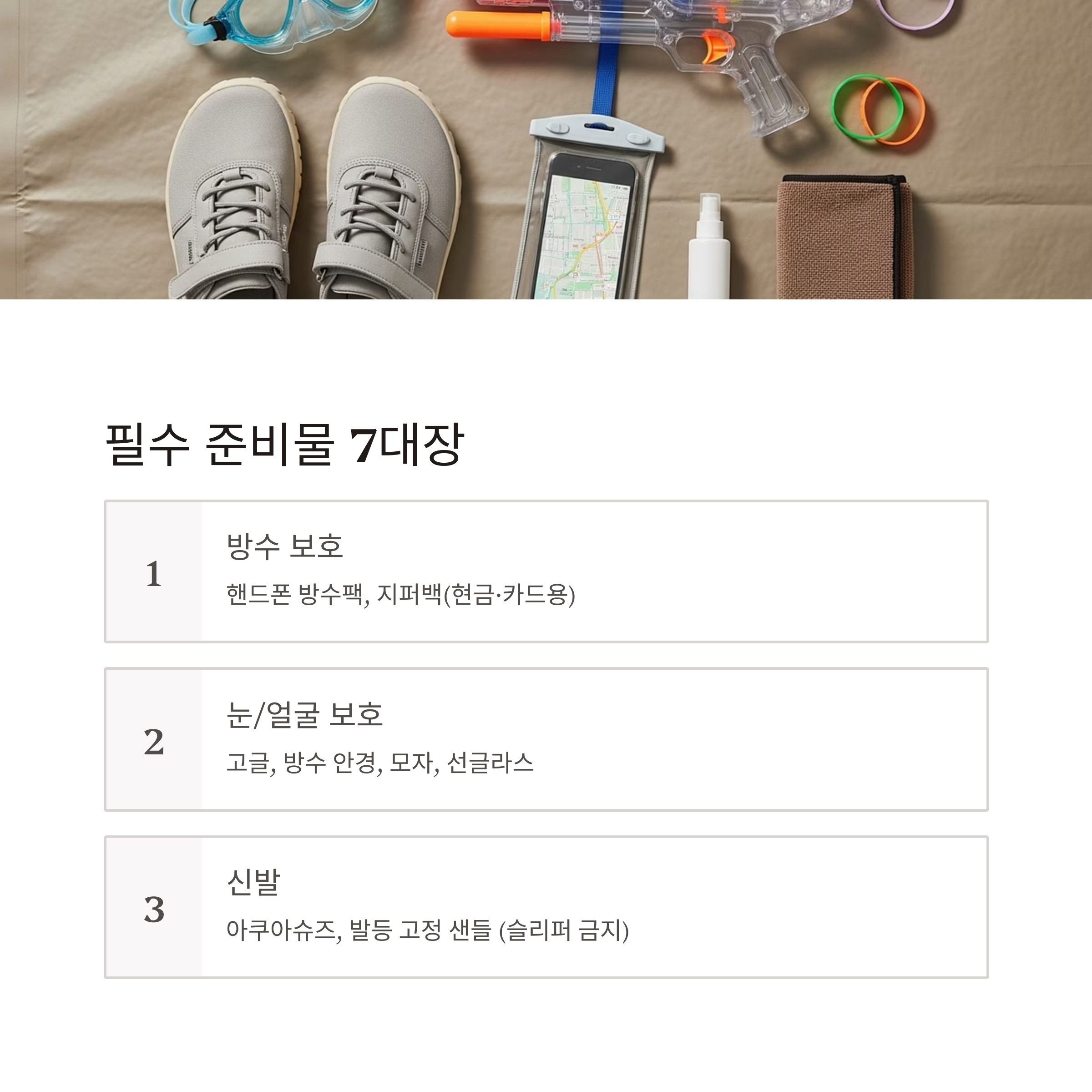 | 현장 필수 | 물총, 힙색 또는 백팩, 압박스타킹 (선택) |