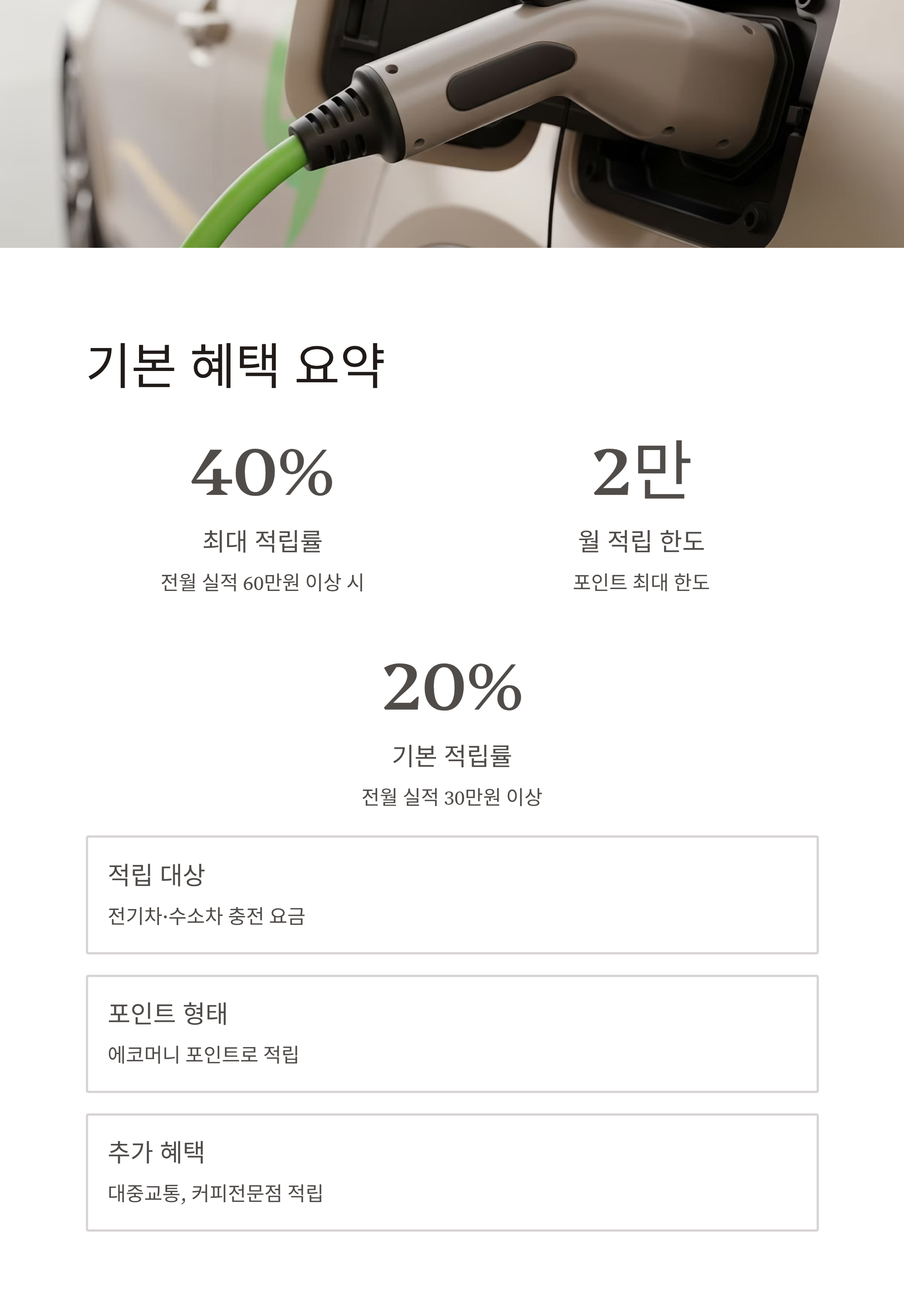 적립 대상 | 전기차·수소차 충전 요금 (지정 충전소 결제 시 적용) |